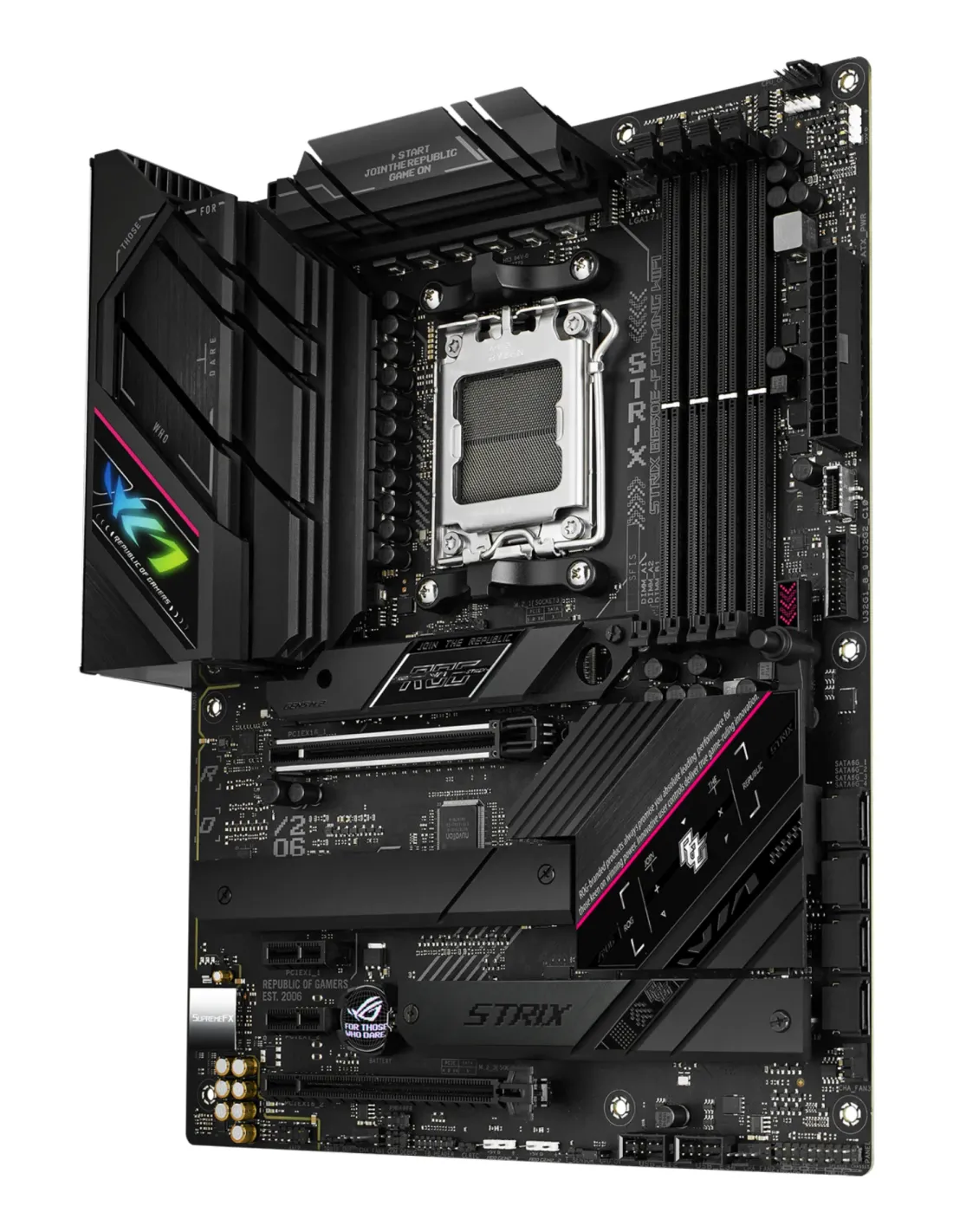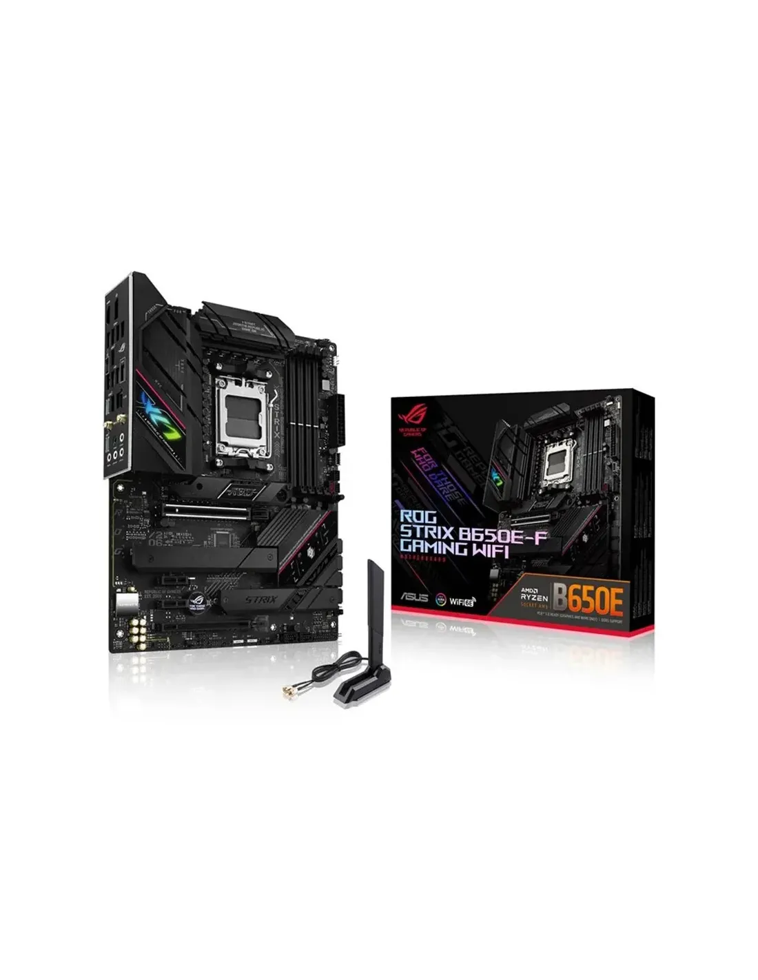 ASUS ROG STRIX B650E-F GAMING WIFI. Produttore processore: AMD, Presa per processore: Socket AM5, Processori compatibili: AMD Ryzen™ 7. Tipi di memoria supportati: DDR5-SDRAM, RAM massima supportata: 128 GB, tipo di slot di memoria: DIMM. Interfacce dell'unità di archiviazione supportate: M.2, SATA III, Tipi di unità di archiviazione supportate: HDD & SSD, Livelli RAID: 0, 1, 10. Tipo di interfaccia Ethernet: 2.5 Gigabit Ethernet, Controller LAN: Intel I225-V, Wi-Fi standard: Wi-Fi 6E (802.11ax). Componente per: PC, Fattore di forma scheda madre: ATX, Famiglia di chipset per scheda madre: AMD