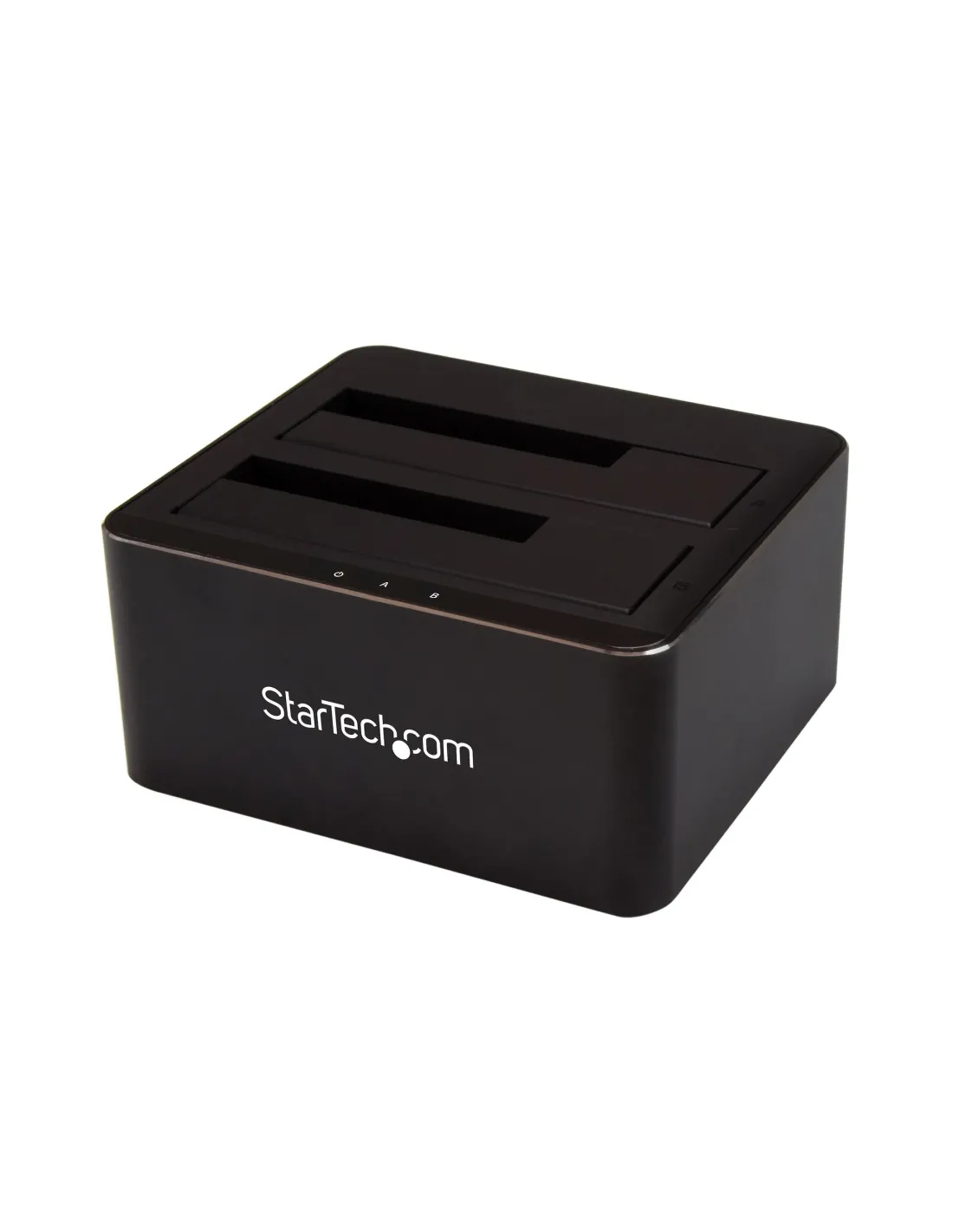 StarTech.com Docking Station a Doppio Bay SATA per 2x 2,5/3,5" SATA SSD/HDD - USB 3.0. Tipologia disco rigido: HDD, SSD, Interfaccia dispositivo di archiviazione: SATA, Seriale ATA II, Serial ATA III, Dimensioni dei dispositivi di archivio supportati: 2.5,3.5". Interfaccia host: USB 3.2 Gen 1 (3.1 Gen 1) Type-B. Colore del prodotto: Nero, Materiali: Alluminio, Plastica, Massima velocità di trasferimento: 6 Gbit/s. Tensione di ingresso AC: 100 - 240 V, Corrente d'ingresso: 1.5 A, Voltaggio di uscita: 12 V. Larghezza: 130 mm, Profondità: 114 mm, Altezza: 62 mm