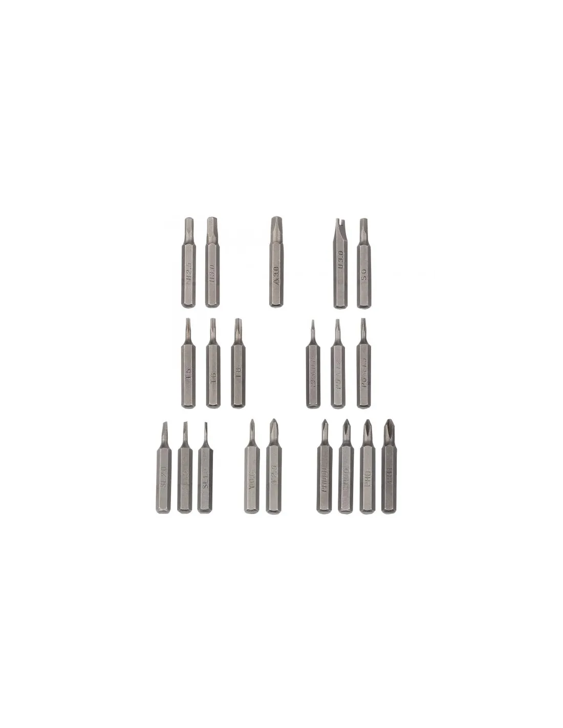 - PUNTE DI PRECISIONE: set da 20 pezzi; Phillips (PH000/PH00/PH0/PH1), a taglio (SL1.0/SL1.5/SL2.0), (TORX T5), TORX Security T6/T8, esagonali (H2.5/H3.0), Pentalobe P2(0.8)/P5(1.2)/P6(1.5), a chiave (U3.0), Tri-Wing (Y0.6/Y2.5), triangolo 3.0, Robertson S0