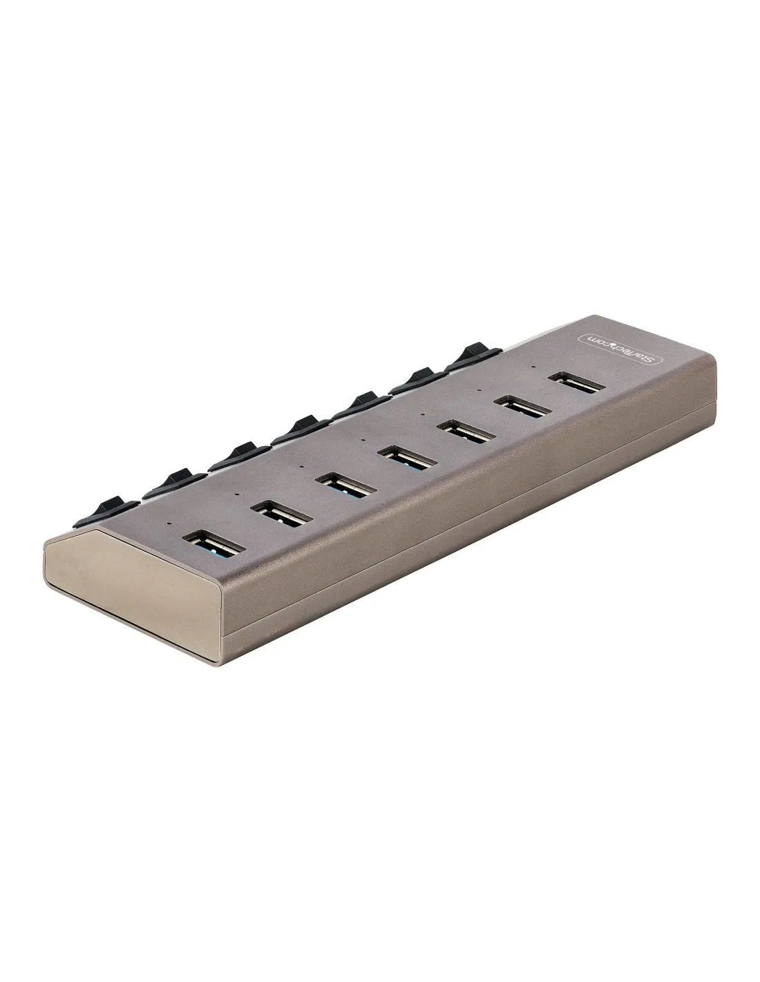 Questo hub USB 3.2 Gen 1 (5Gbps) a 7 porte aggiunge sette porte USB Type-A a un computer, con il vantaggio che ogni porta dispone di un interruttore individuale on/off. L'hub USB è autoalimentato grazie all'alimentatore incluso. Si può collegare ad una porta USB-A o USB-C di un computer portatile o desktop.
