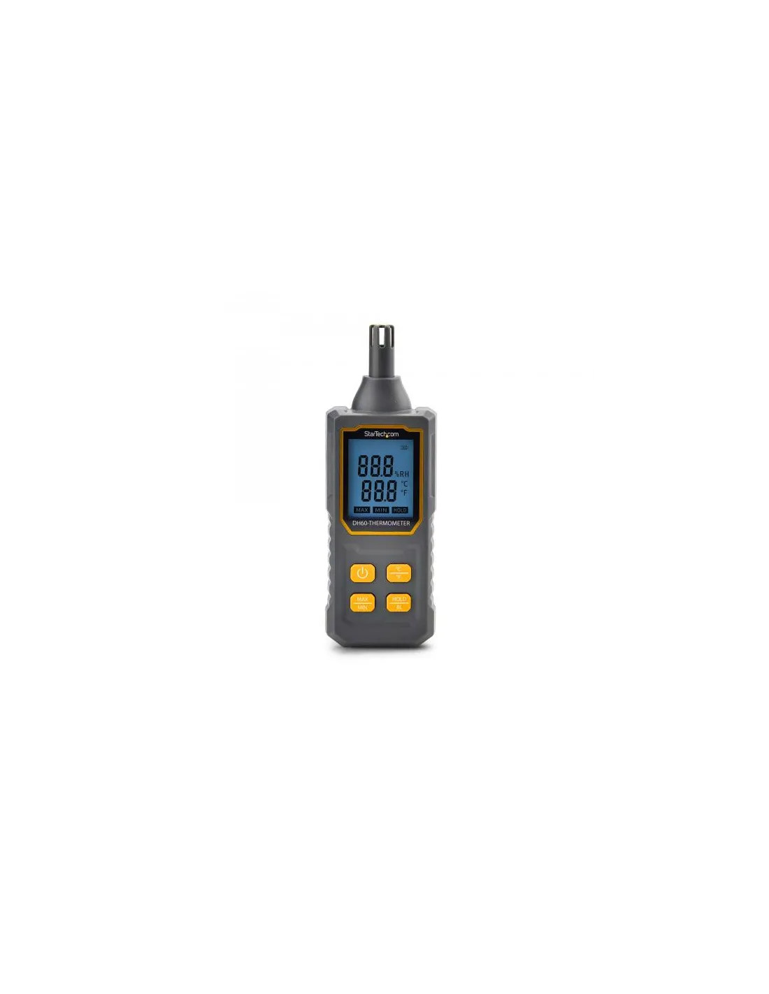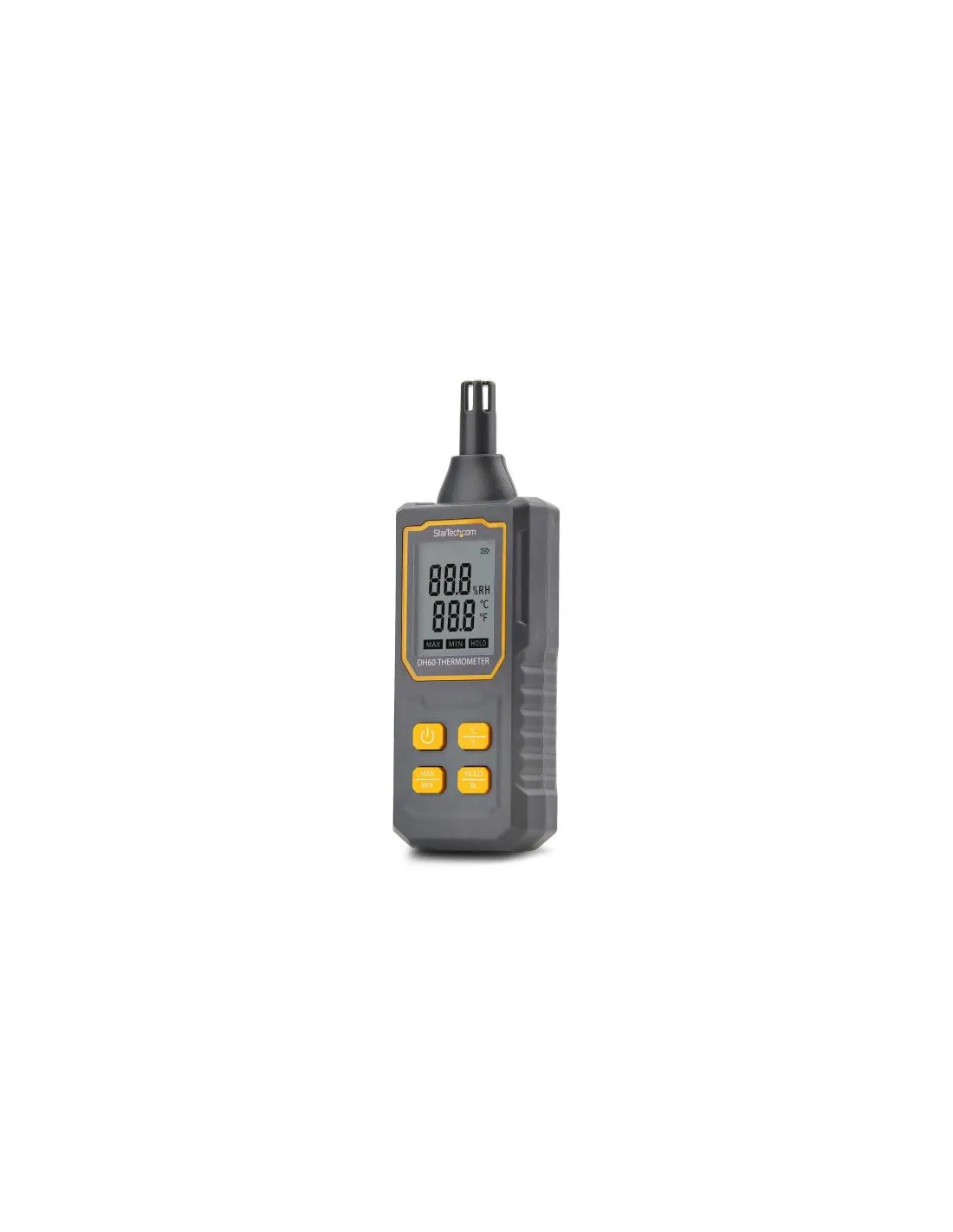 Questo igrometro portatile è in grado di effettuare letture precise in un intervallo di temperatura da -10 a 60° C e di umidità relativa (RH) da 0 a 100% con una risoluzione di 0,1°C e 0,1% RH. È possibile passare da un'unità di misura della temperatura all'altra o visualizzare le letture minime e massime con la semplice pressione di un pulsante.