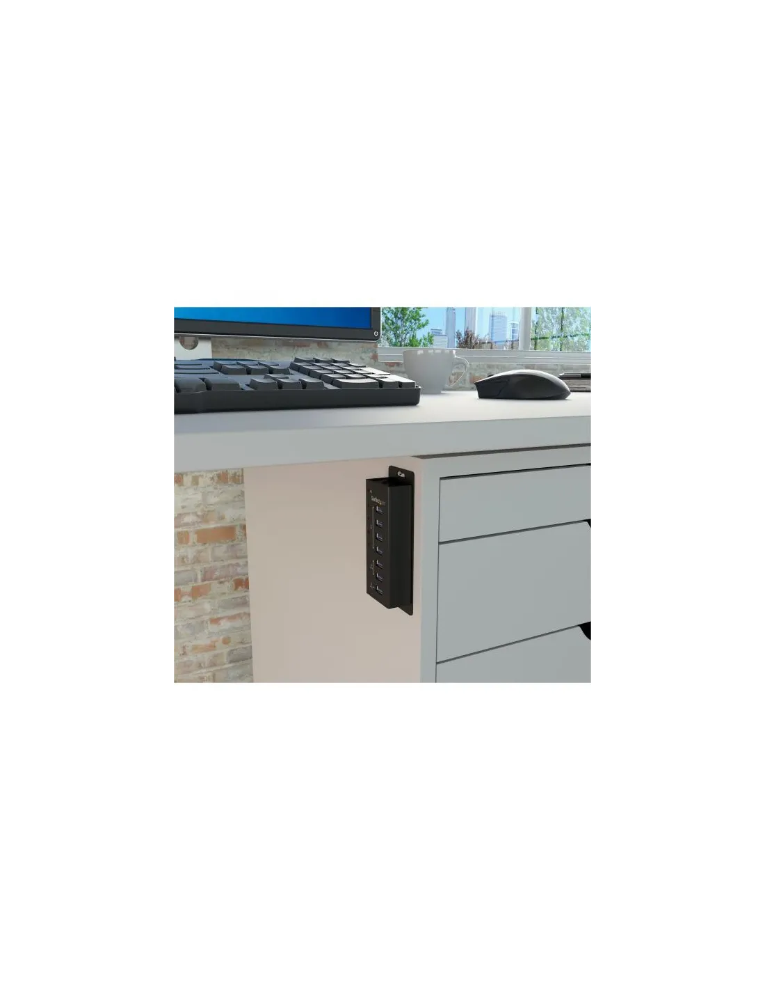 Progettato per un accesso rapido alle porte durante il collegamento o lo scollegamento di dispositivi, l'hub presenta una disposizione verticale delle porte con un resistente box esterno compatto, in metallo. Per una maggiore flessibilità, l'hub comprende una staffa per le installazioni con montaggio a parete.