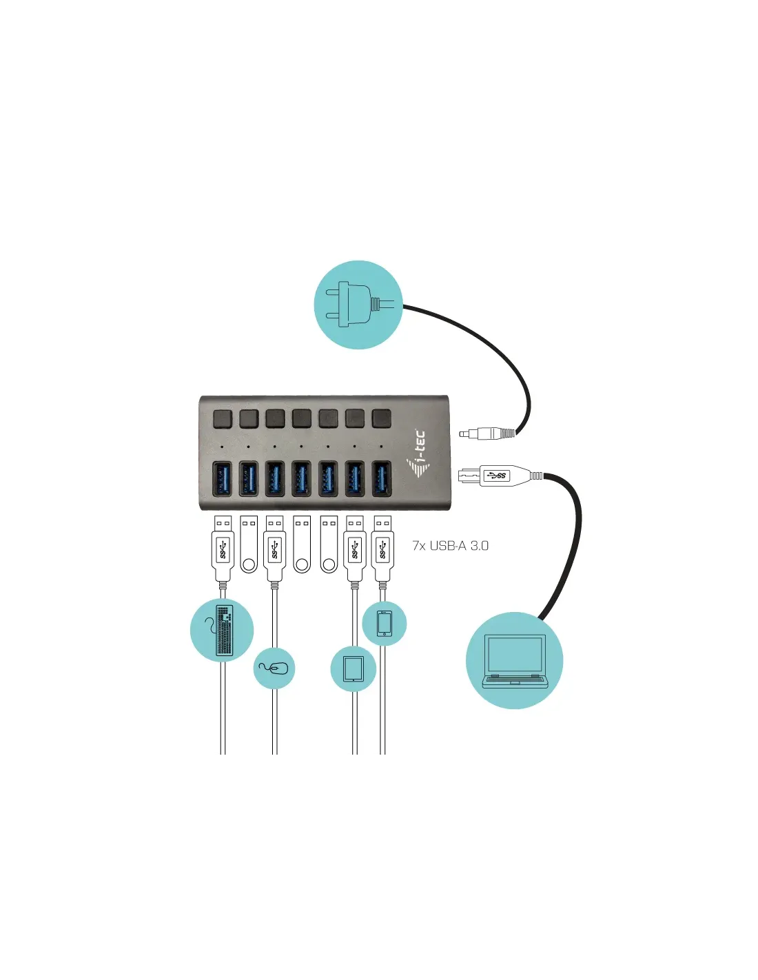 Questo HUB offre 7 porte USB 3.0 con funzione Plug&Play e ricarica USB standard. L’HUB rileva automaticamente se è stato collegato un dispositivo per la ricarica USB grazie a ciò l’HUB ha 7 porte USB 3.0, quindi, è possibile ricaricare 7 dispositivi alla volta. L’interfaccia USB 3.0 è importante in particolare per trasmettere dati da chiavette o schede di memoria USB 3.0 siccome raggiunge alte velocità. Utilissimo è anche l’adattatore di alimentazione esterno compreso nella confezione senza il quale l’HUB non può fare a meno. Questo adattatore garantisce l’alimentazione continua tramite le porte USB e la potenza fino a 10 W per una porta.