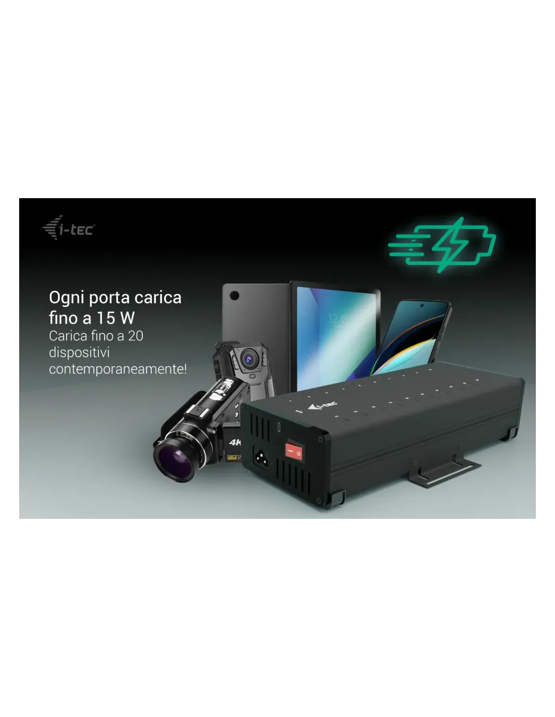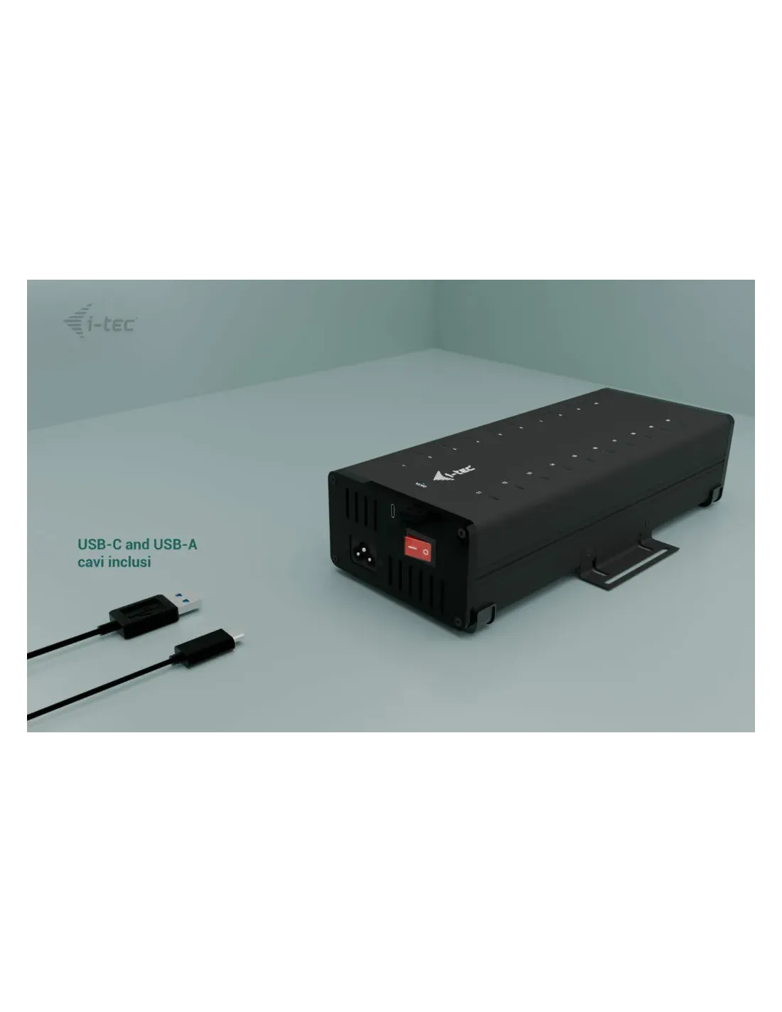 i-tec USB-C/USB-A Metal Charging + data HUB, 15W per port, 20x USB-C. Tipo di caricatore: Interno, Tipologia alimentazione: AC, Compatibilità caricatore: Universale. Voltaggio di ingresso: 100-240 V, Tensione di uscita (max): 12 V. Quantità di porte USB Tipo C: 20, Ricarica rapida, Funzionalità di protezione dell'alimentazione: Sovracorrente, Sovraccarico, Cortocircuito. Colore del prodotto: Nero