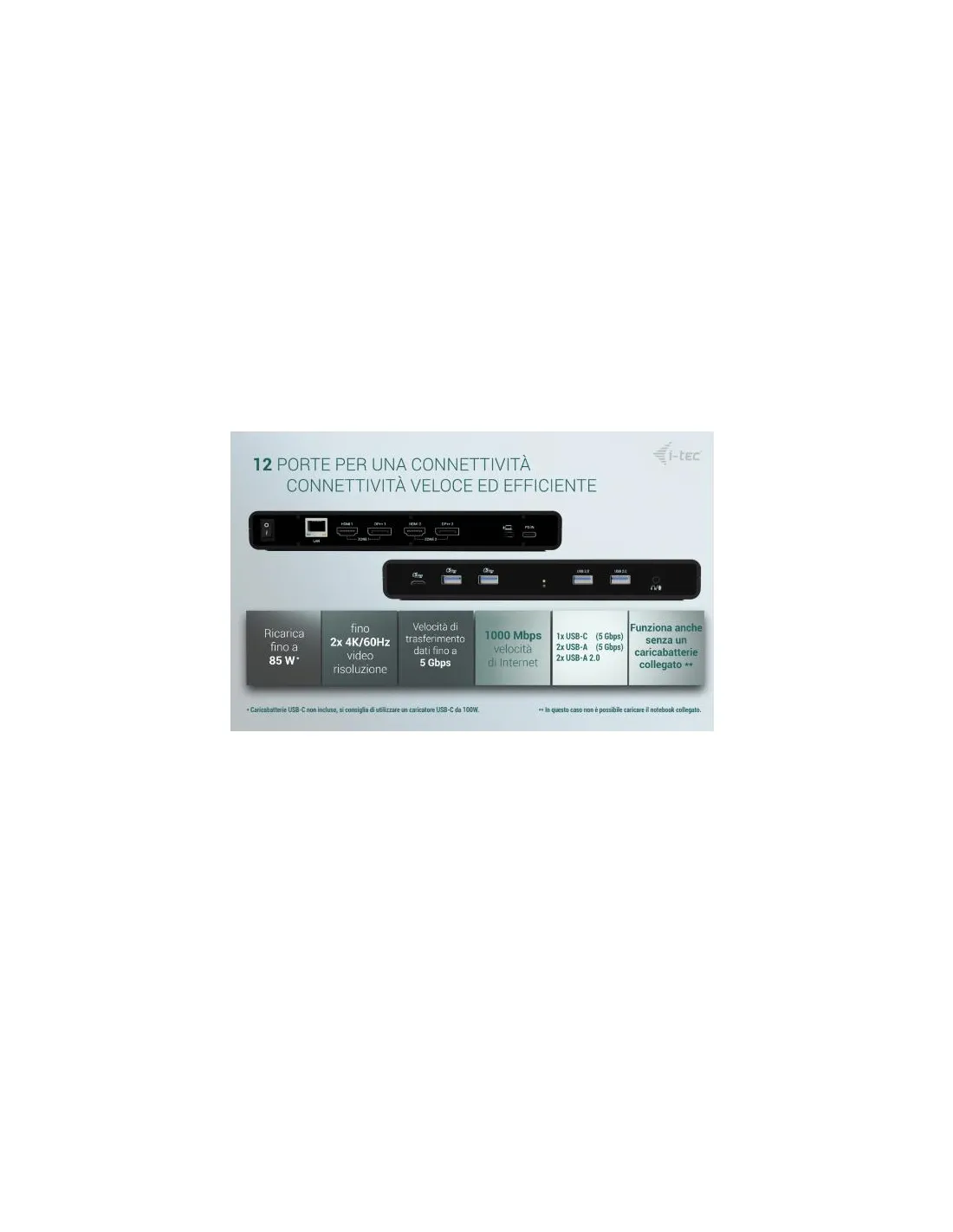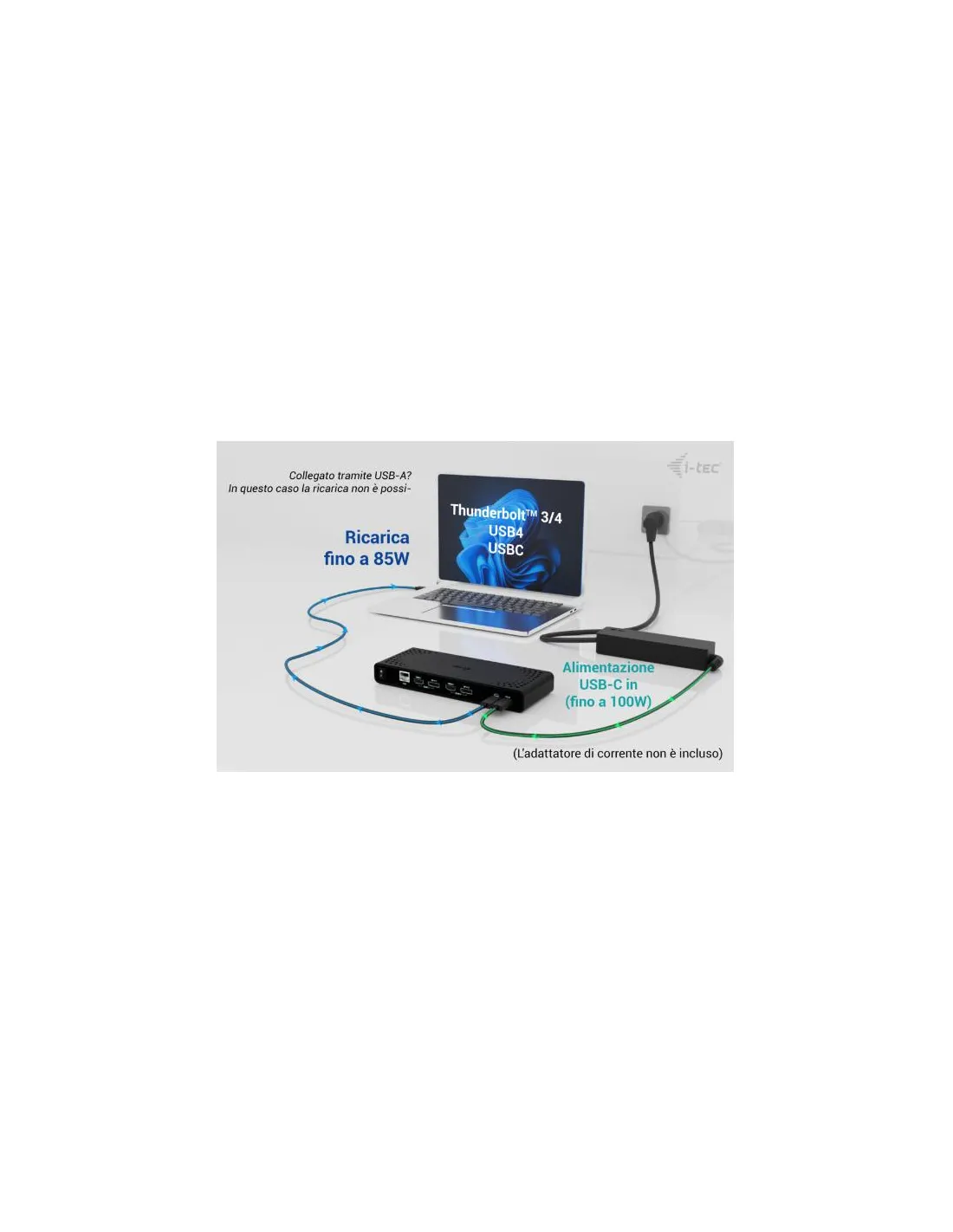 Nota: il caricatore USB-C non è incluso. La docking station può essere utilizzata senza caricabatterie o con il caricabatterie fornito con il laptop, ad esempio, oppure il caricabatterie può essere acquistato separatamente, ad esempio i-tec CHARGER-C100W In alternativa, è possibile acquistare il kit di prodotti CADUA4KDOCKPDB100, che include già un alimentatore.