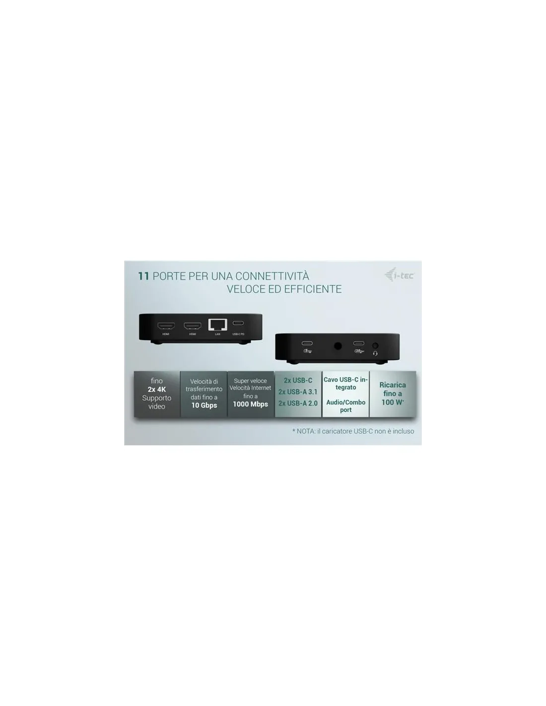 I-Teci-tec USB-C Dual HDMI Docking Station with Power Delivery 100 Wi-tec USB-C Dual HDMI Docking Station with Power Delivery 100 W. Tecnologia di connessione: Cablato, Interfaccia host: USB 3.2 Gen 2 (3.1 Gen 2) Type-C, Fornitura di alimentazione USB fino a: 100 W. Velocità trasferimento Ethernet LAN: 10,100,1000 Mbit/s. Colore del prodotto: Nero, Velocità di trasferimento dati: 10 Gbit/s, Risoluzione (digitale massima): 3840 x 2160 Pixel. Tipologia alimentazione: USB, Connettore di alimentazione: USB tipo-C, Voltaggio di uscita: 20 V. Sistema operativo Windows supportato: Windows 10, Windows 11, Altri sistemi operativi supportati: Android, ChromeOS, iPadOS