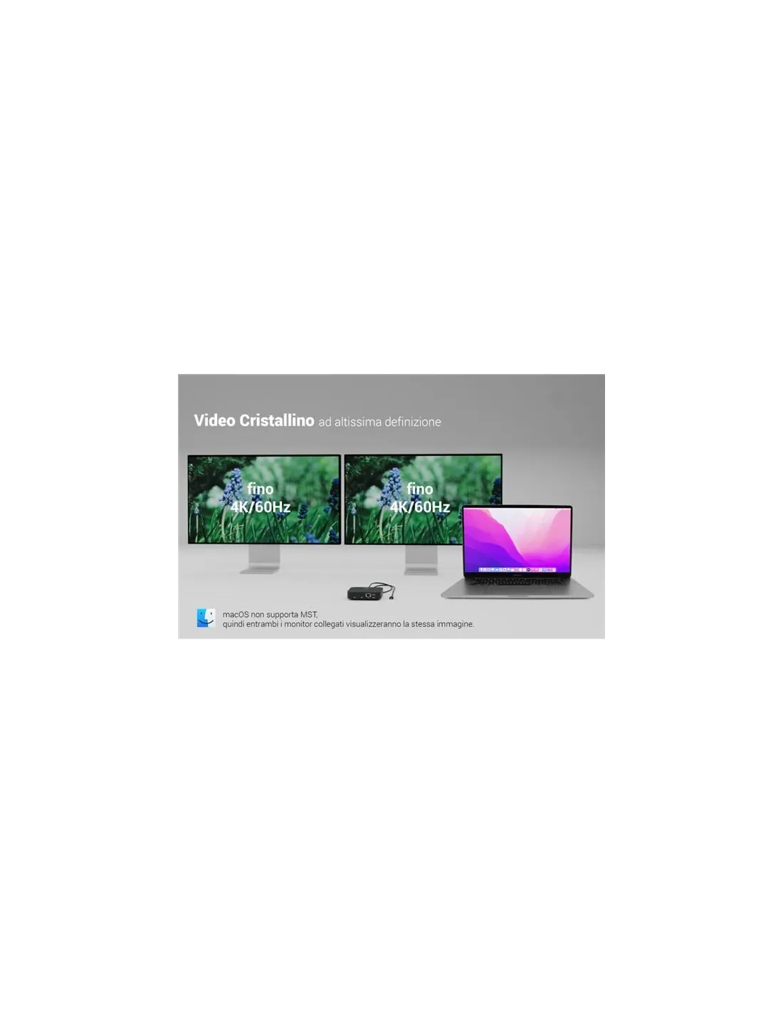 1 cavo USB-C integrato per il collegamento a un dispositivo host (100 cm) Tecnologia docking station: USB-C (MST) + USB-C PD Alimentazione: fino a 100 W Porte video: 2x HDMI 2.0 Risoluzioni: Dispositivo host con supporto DisplayPort 1.2: 1 monitor: 1x HDMI ? fino a 4K/30Hz 1x HDMI ? fino a 1080p/120Hz 2 monitor: 2x HDMI ? fino a 2x 1080p/60Hz* Dispositivo host con supporto DisplayPort 1.4: 1 monitor: 1x HDMI ? fino a 4K/60Hz 1x HDMI ? fino a 1440p/144Hz o 1080p/240Hz 2 monitor: 2x HDMI ? fino a 2x 1440p/60Hz* o 2x 4K/30Hz* Dispositivo host con DisplayPort 1.4 con supporto DSC: 1 monitor: 1x HDMI ? fino a 4K/60Hz 1x HDMI ? fino a 1440p/144Hz o 1080p/240Hz 2 monitor: 2x HDMI ? fino a 2x 4K/60Hz* o 1440p/144Hz* 1x USB-C 3.2 Gen 2 (10 Gbps) 1x USB-C 3.2 Gen 1 (5 Gbps) 2x USB-A 3.2 Gen 1 (5 Gbps) 2x USB-A 2.0 1x porta USB-C Power Delivery (fino a 20 V/5 A, max 100 W) + dati USB Gen 2 (10 Gbps) 1x Ethernet RJ-45 1Gbps 1x porta audio combinata da 3,5 Clonazione indirizzo MAC: Sì (utilizzando il software i-tec Docker Pro) Indicatore LED Interruttore ON/OFF per la docking station Supporto per lucchetto Kensington OS: Windows 10 / 11, macOS*, Android**, iPadOS**, ChromeOS, Linux Dimensioni del prodotto: 113 x 113 x 26 mm Peso del prodotto: 242 gRequisiti hardware: Dispositivo con USB-C, USB4 o Thunderbolt™ 3/4/5 liberoRequisiti di alimentazione: Dispositivo con USB-C, USB4 o Thunderbolt™ 3/4/5 libero con supporto Power DeliveryRequisiti di uscita video: Dispositivo con porta USB-C o USB4 libera con supporto “DisplayPort Alternate Mode” o Thunderbolt™ 3/4/5.Sistema operativo: Windows 10 / 11, macOS*, Android**, iPadOS**, ChromeOS, Linux * macOS non supporta la tecnologia Multi Stream Transport (MST). Collegando due monitor alla stazione su macOS, entrambi i monitor mostreranno la stessa immagine.** iPadOS e Android non supportano la tecnologia di trasferimento video multischermo, né l’opzione schermo esteso. Ciò significa che quando si collega un monitor esterno, verrà visualizzato solo lo schermo specchiato. (Non valido per gli androidi con estensione DEX e Easy Projection).La docking station può essere utilizzata anche senza l’adattatore di alimentazione collegato. In questo caso, le uscite video HDMI, la porta di rete LAN (RJ-45), l’audio / microfono e entrambe le porte USB-A 2.0 funzioneranno sempre. Tuttavia, le porte USB-A 3.2 Gen 1 e la porta dati USB-C potrebbero non funzionare quando si collegano dispositivi con requisiti energetici più elevati (come SSD e in particolare unità NVMe). In tal caso si può verificare lo spegnimento della docking station. Per utilizzare tutte le porte e ottenere la massima velocità di trasferimento dei dati, si consiglia di utilizzare la docking station con alimentatore collegato.- Colore del prodotto
