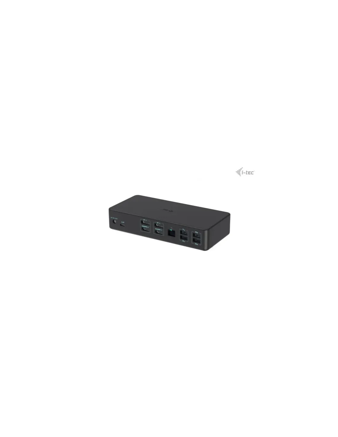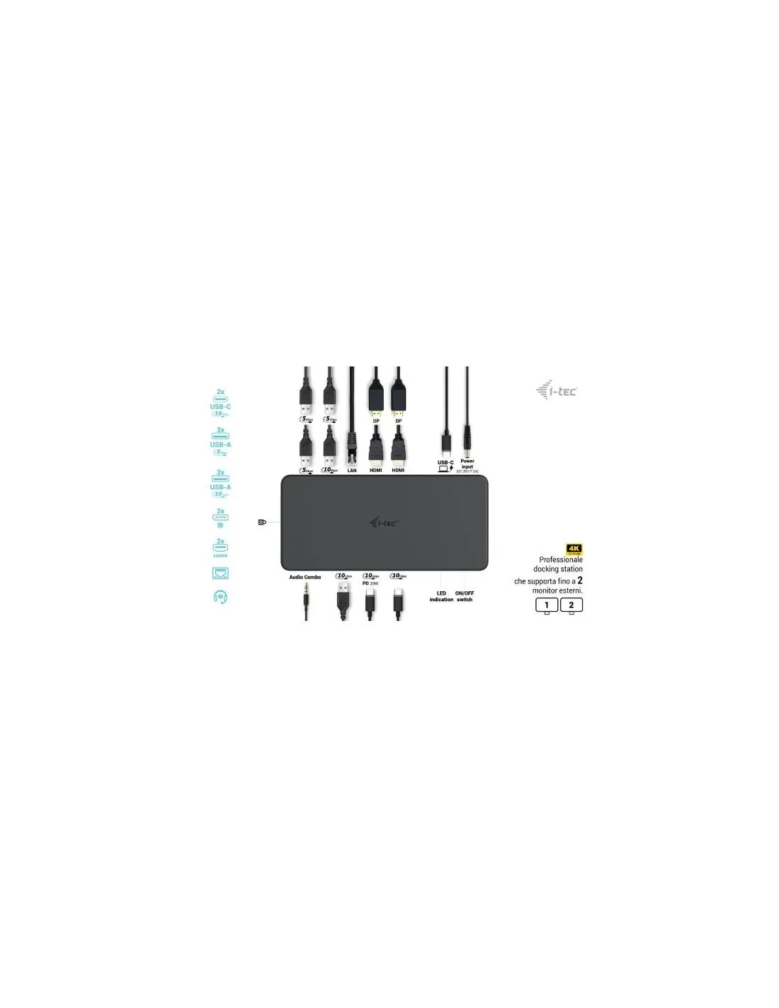 1x porta USB-C per il collegamento al dispositivo host con porta USB-C o USB-A (il cavo USB-C e l’adattatore da USB-C a USB 3.0 sono inclusi)Tecnologia della docking station: DisplayLink + USB-C PDConsegna di energia: 96WPorte video:2x Display Port (supporto DP++)2 HDMIRisoluzioni supportate:1 monitor – 1x DP ? fino a 4K/60Hz1 monitor – 1x HDMI ? fino a 4K/60Hz1 monitor – 2x DP ? fino a 5K/60Hz*2 monitor – 1x DP + 1x DP ? fino a 2x 4K/60Hz2 monitor – 1x DP + 1x HDMI ? fino a 2x 4K/60Hz2 monitor – 1x HDMI + 1x HDMI ? fino a 2x 4K/60Hz1 porta USB-C 3.2 Gen 2 (solo dati), BC 1.21x porta USB-C 3.2 Gen 2, PD 20W1x porta USB 3.2 Gen 2, BC 1.21 porta USB 3.2 Gen 23 porte USB 3.2 Gen 11 porta Ethernet GLAN RJ-45 (DisplayLink DL-6950)1x porta audio combo da 3,5 mm, che supporta la frequenza di campionamento e la registrazione di alta qualità a 32 bit/192 kHz1 ingresso di alimentazione (DC 20V/7,5A)Clonazione dell’indirizzo MAC: Sì (utilizzando il software i-tec Docker Pro)WOL: S1, S2, S3Interruttore On/Off per accendere e spegnere la docking stationIndicatore LEDSupporto per il blocco KensingtonSupporto per il montaggio VESA (codice VESADOCK1)Cavo USB-C con adattatore da USB-C a USB-A (100 cm)OS: Windows 10 / 11, macOS, Android 5 o successivo, Chrome OS R51 o successivo, Linux UbuntuFacile installazione del driver (Windows, MacOS, Ubuntu, Android (external link))Dimensioni del prodotto: 190x88x37 mmPeso del prodotto: 539 gDimensioni della confezione: 253 x 200 x 54 mm* La risoluzione 5K è supportata solo da Windows