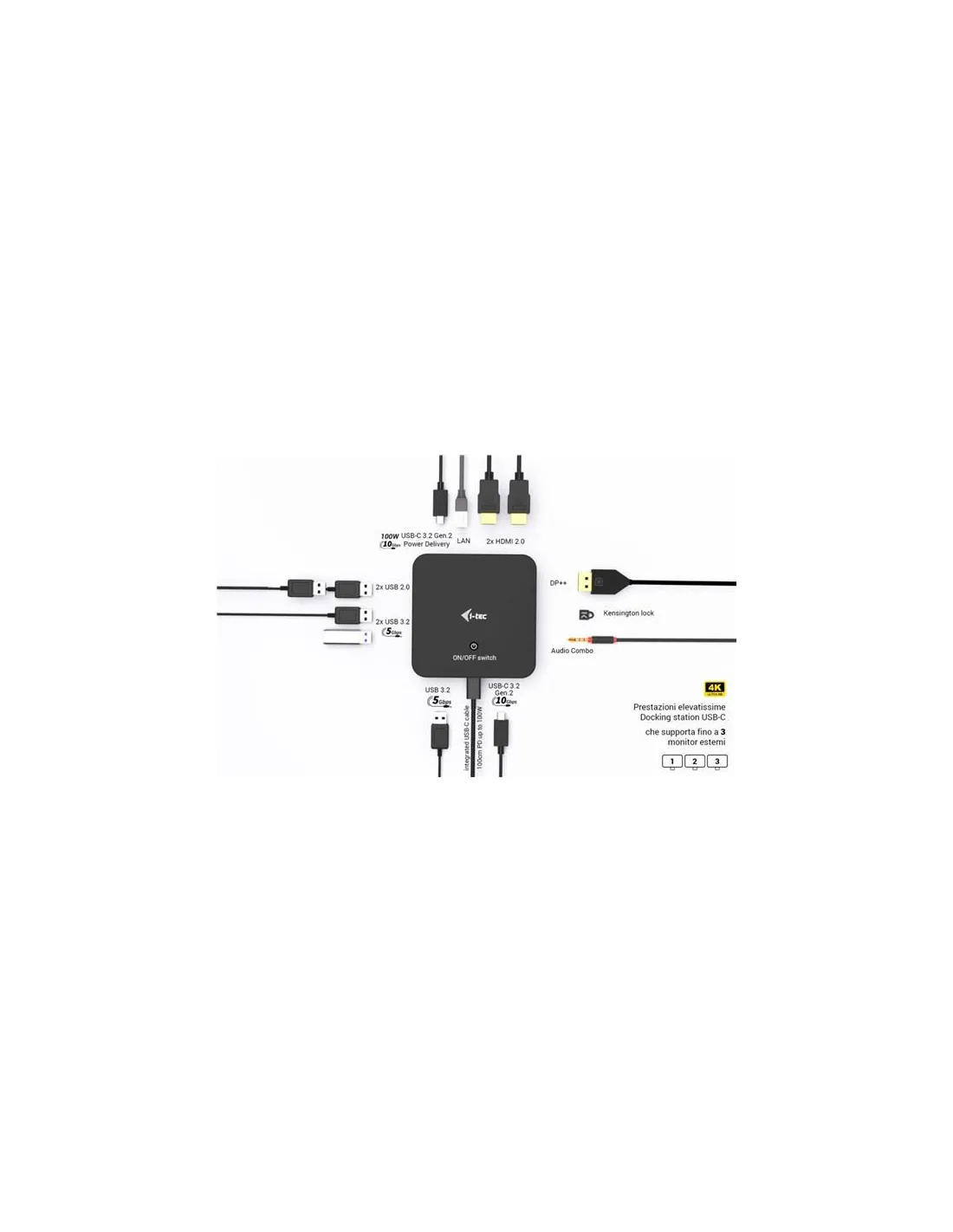 I-TecC31TRIPLEVIDEODPPROUn dock da ufficio USB-C ad alte prestazioni che supporta fino a 3 monitor esterni 4K. Il dock è compatibile con qualsiasi laptop dotato di porta USB-C, USB4 o Thunderbolt 3/4/5. Naturalmente, supporta la ricarica del laptop o del tablet, fino a 100 W.Il protocollo DP 1.4 DSC integrato di ultima generazione supporta anche la risoluzione 5K/60 Hz, apprezzabile da grafici professionisti, analisti di dati, montatori cinematografici o appassionati di video ad alta definizione.Il dock è disponibile in due varianti: senza l’adattatore di ricarica USB-C incluso (codice prodotto C31TRIPLEVIDEODPPRO – questa versione) con adattatore da 100 W incluso (codice prodotto C31TRI4KDPDPRO100)Nota: il sistema operativo macOS non supporta la tecnologia di trasmissione video Multi Stream Transport (MST), il che significa che se collegato a macOS, la stessa immagine verrà proiettata su tutti i monitor collegati. Collega fino a tre monitor 4K esterni Frequenza di aggiornamento fino a 240 Hz (quando collegato a un singolo monitor 1440p) Alimentazione: fino a 100 W 2x HDMI, 1x DisplayPort++ 3x USB 3.2 (5 Gbps), 1x USB-C 3.2 Gen2 (10 Gbps) e 2x USB 2.0 consentono di collegare facilmente dispositivi USB e periferiche. Gigabit Ethernet RJ-45 offre una connessione affidabile, robusta e ad alta velocità Jack combinato audio e microfono sul pannello frontale Il lucchetto Kensington offre protezione antifurto, soprattutto in uffici condivisi o aree pubbliche L’interruttore di alimentazione della docking station consente il massimo risparmio energetico La docking station supporta un supporto VESA per un’installazione verticale intelligente dietro un monitor compatibile con VESA Supporta Windows 10/11, macOS, Android, iPadOS, ChromeOS e LinuxLa docking station può essere utilizzata senza un alimentatore collegato. In questo caso, le uscite video, LAN (RJ-45), audio/microfono ed entrambe le porte USB 2.0 saranno sempre funzionanti. Tuttavia, le porte USB 3.2 e la porta dati USB-C potrebbero non funzionare quando si collegano dispositivi con requisiti di alimentazione più elevati (ad esempio SSD, in particolare unità NVMe). In questo caso, la docking station potrebbe spegnersi. Si consiglia di utilizzare la docking station con un alimentatore collegato per garantire che tutte le porte siano utilizzabili e che si raggiungano le massime velocità di trasferimento dati.Nota: se collegato a un dispositivo Android, il dock funzionerà solo con l’alimentatore collegato.NOTA: il caricatore USB-C non è incluso. Se è necessaria una docking station con caricatore USB-C incluso, prendere in considerazione la versione con numero di prodotto C31TRIVIDPRO100W