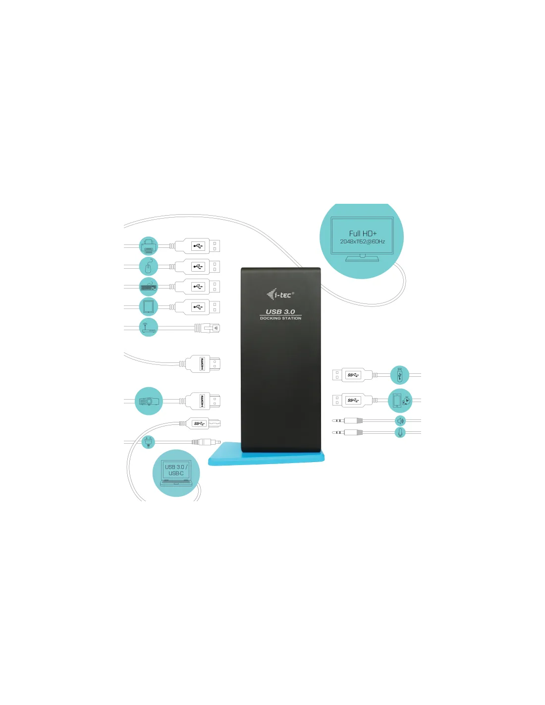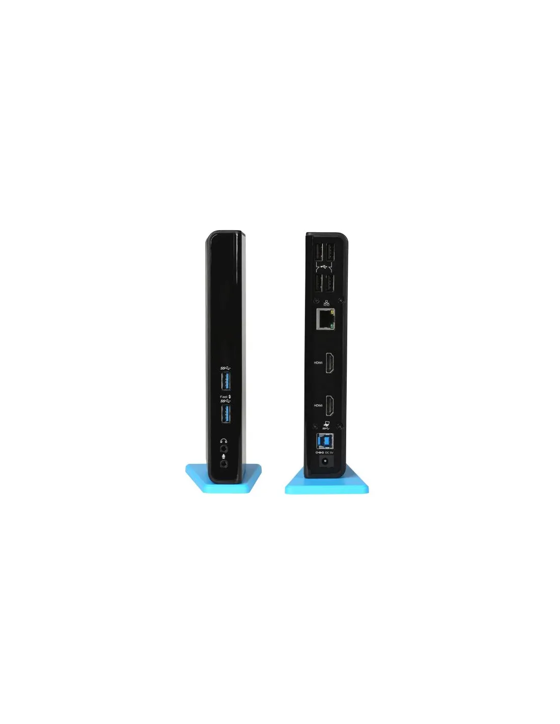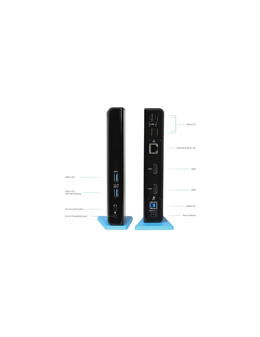Docking station universale compatibile con tutti i marchi e modelli di notebook, viene fornita con un cavo USB 3.0 da 100 cm con adattatori integrati per USB-C e Thunderbolt 3. La stazione supporta fino a 2 monitor esterni, che si collegano grazie alle porte HDMI. 6 porte USB, connessione internet affidabile e veloce grazie alla porta LAN integrata e non manca neanche il supporto per ingresso e uscita audio.