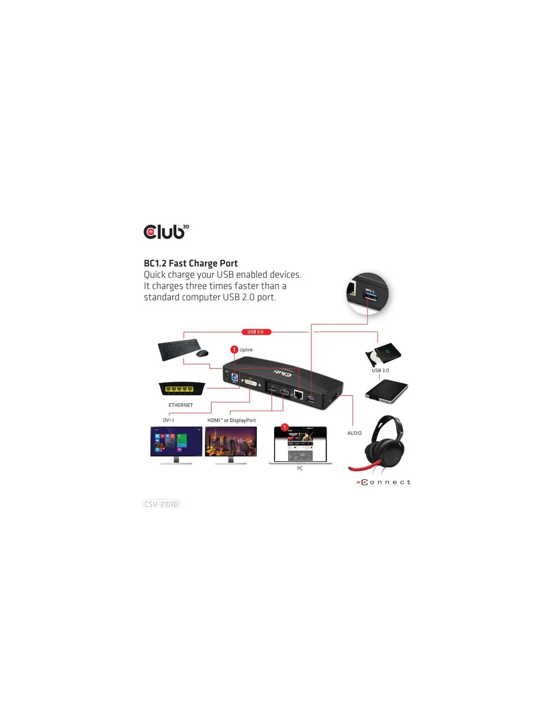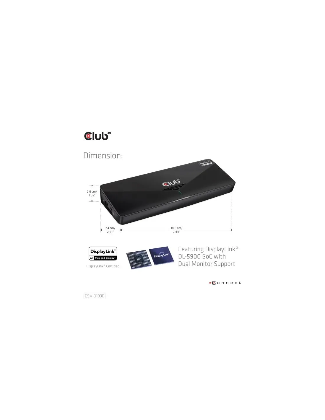 Il club 3D CSV-3103D è una docking stazione UHD 4K USB 3.2 UHD UHD è progettata per tutte le tue esigenze di connettività. Con le porte Gen1 USB 3.2 incorporate, la docking Station consente di godere della trasmissione dei dati super velocità (fino a 5 Gbps) delle periferiche USB, riducendo il clutter del cavo e portando dati e displayLink® certificata connettività al tuo notebook o tablet tramite un Porta uplink Gen1 Single USB 3.2.