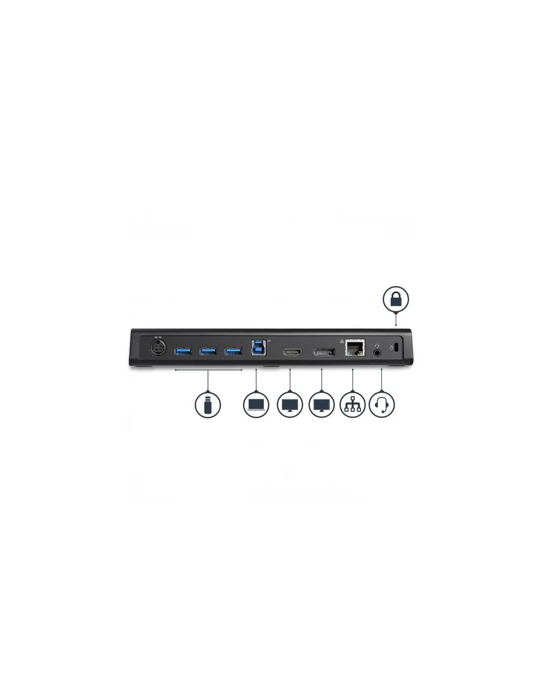 Questa docking station USB 3.0 a due monitor conforme a TAA offre un hub USB 3.0 a 4 porte, connettori audio per microfono e cuffia, una porta USB a ricarica rapida e una porta GbE RJ45 con Wake On LAN (WOL).