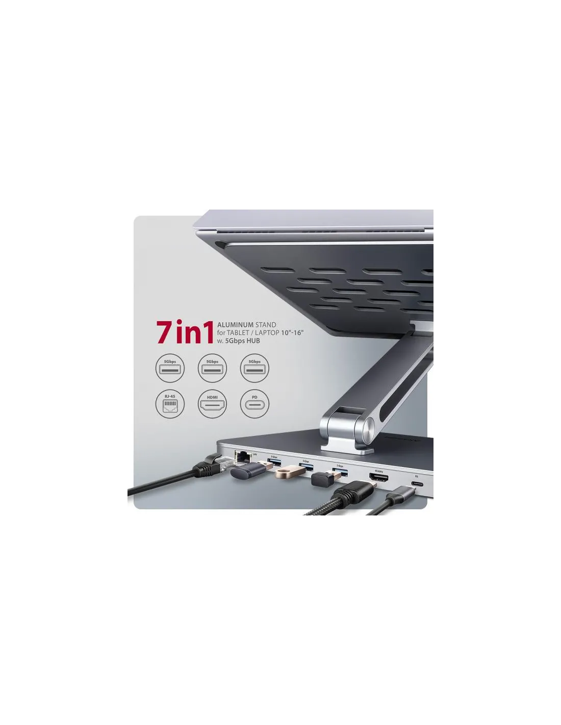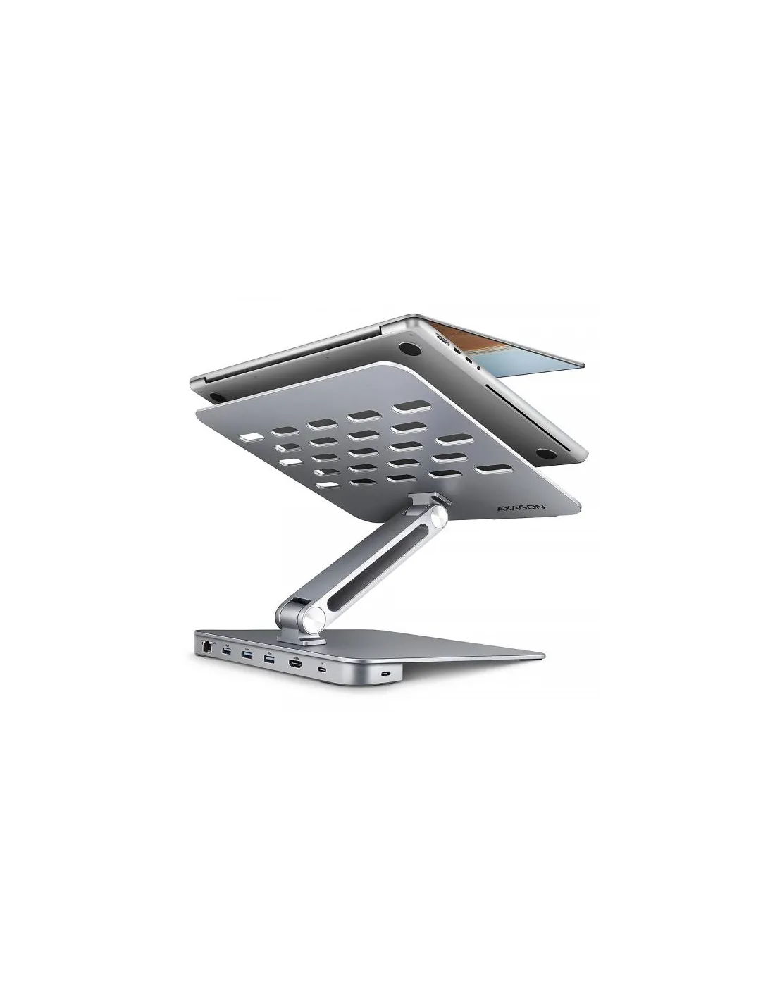 Axagon HMC-STND. Colore del prodotto: Argento, Dimensione massima compatibile dello schermo del notebook: 43,9 cm (17.3"), Certificazione: CE, RoHS. Interfaccia host: USB 3.2 Gen 1 (3.1 Gen 1) Type-C, Interfacce hub: HDMI, RJ-45, USB 3.2 Gen 1 (3.1 Gen 1) Type-A, USB 3.2 Gen 1 (3.1 Gen 1) Type-C, Fornitura di alimentazione USB fino a: 100 W. Larghezza: 54 mm, Profondità: 280 mm, Altezza: 255 mm. Larghezza imballo: 295 mm, Profondità imballo: 262 mm, Altezza imballo: 58 mm. Cavi inclusi: Da USB tipo C a USB tipo C