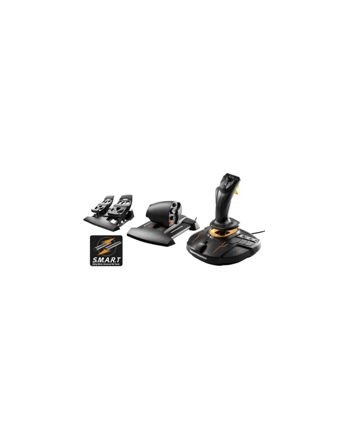 Joystick di volo T.16000M FCS (Flight Control System) con tecnologia magnetica di precisione H.E.A.R.T + manetta TWCS (Thrustmaster Weapon Control System) + TFRP (Thrustmaster Flight Rudder Pedals), entrambi dotati di tecnologia S.M.A.R.T. Intuitivo e naturale: sarà proprio come sedersi nell'abitacolo!