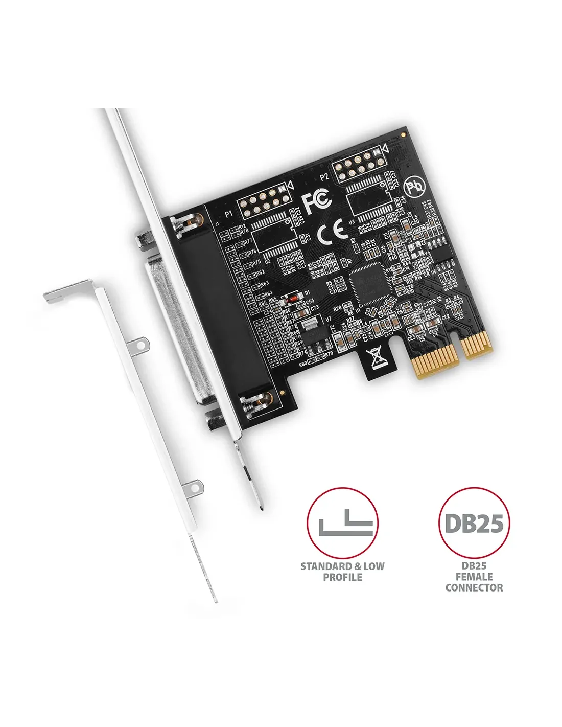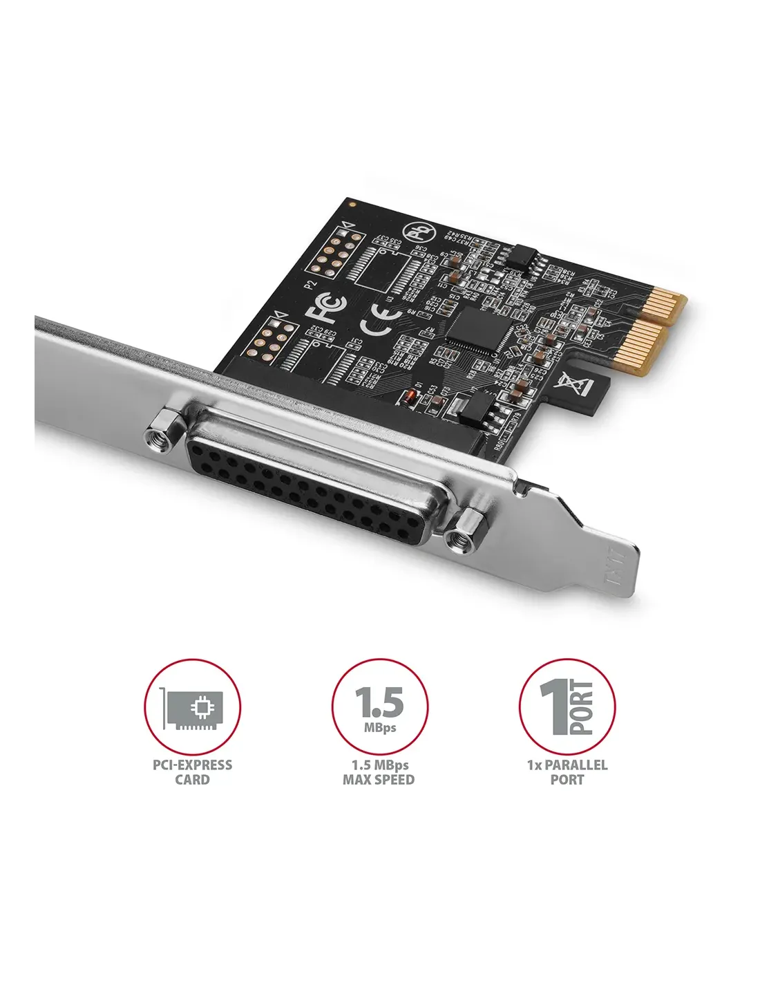 Axagon PCEA-P1N. Interfaccia host: PCIe, Interfaccia di uscita: Parallelo, Genere dell'interfaccia host: Femmina. Paese di origine: Cina, Certificazione: CE, RoHS. Velocità massima di trasmissione: 5 Gbit/s. Quantità per pacco: 1 pz, Larghezza imballo: 110 mm, Profondità imballo: 26 mm