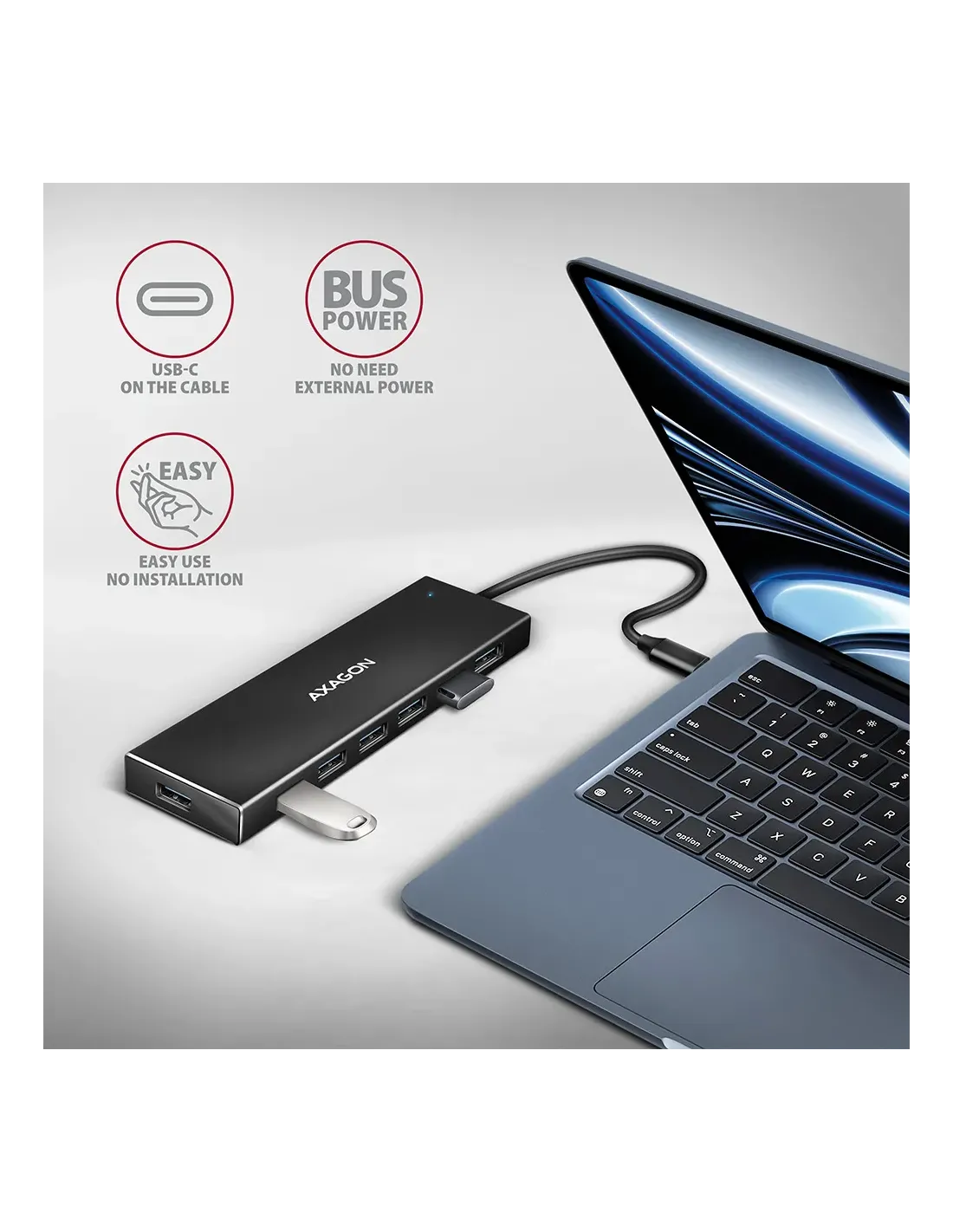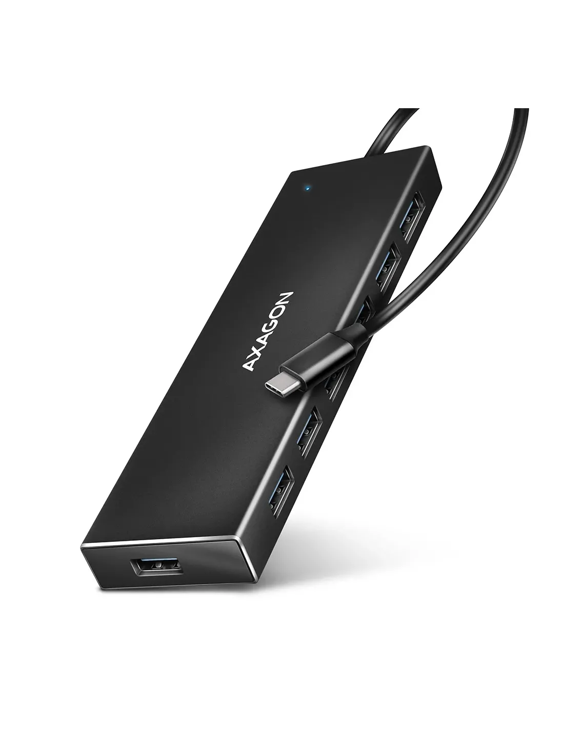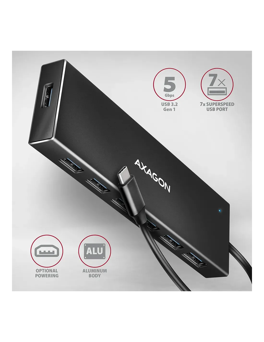 Axagon HUE-F7C 7x USB 3.2 Gen 1 ALU FLAT hub micro power IN 30cm USB-C. Interfaccia host: USB 3.2 Gen 1 (3.1 Gen 1) Type-A, Interfacce hub: USB 3.2 Gen 1 (3.1 Gen 1) Type-C. Velocità di trasferimento dati: 5000 Mbit/s, Colore del prodotto: Nero, Materiale della scocca: Alluminio. Tipo alimentazione: USB. Larghezza: 145 mm, Profondità: 42 mm, Altezza: 15 mm. Quantità per pacco: 1 pz, Larghezza imballo: 245 mm, Profondità imballo: 100 mm