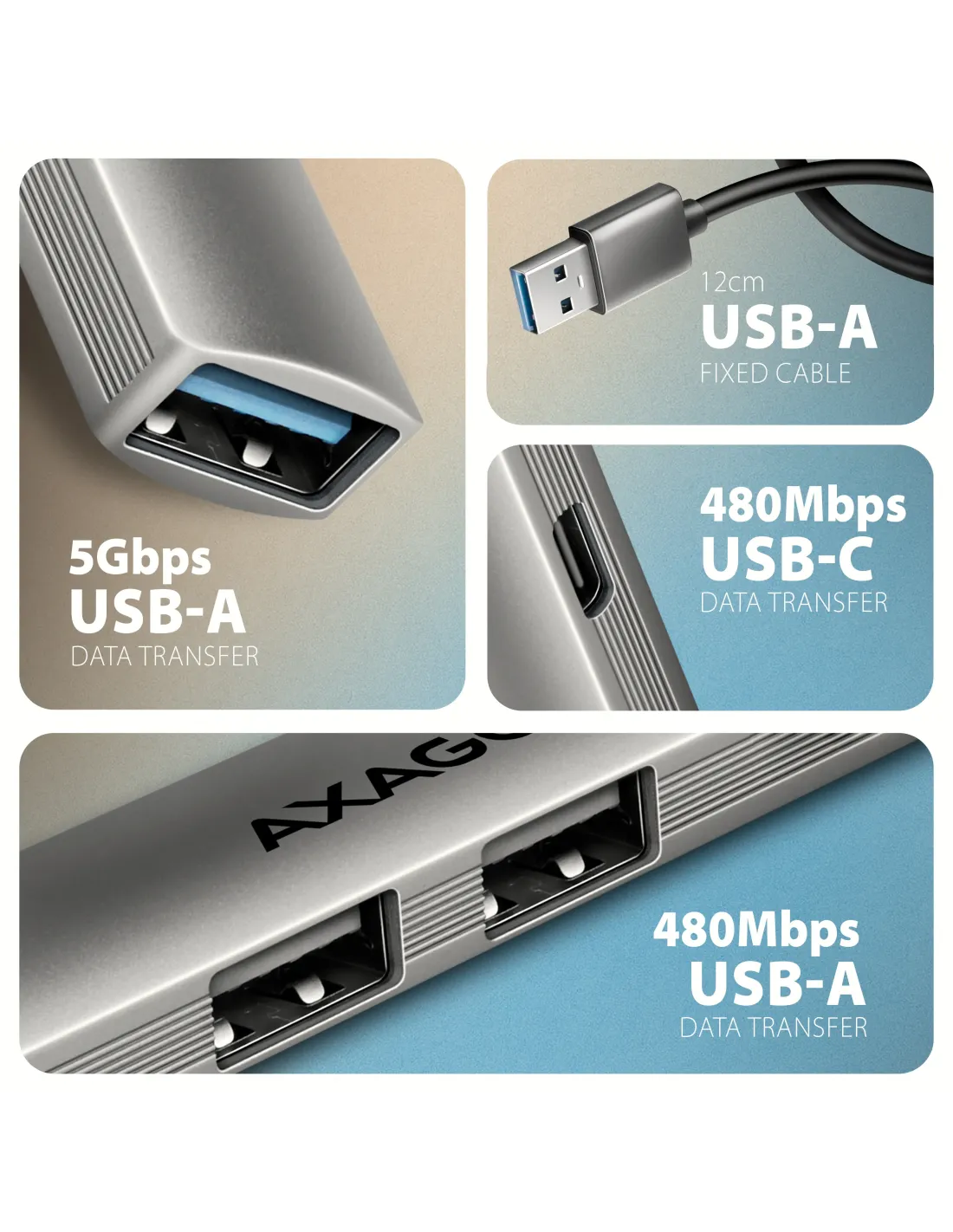 Axagon HUB USB HUE-STA, 4x USB ALU STRIP hub, 1x USB-A 5Gbps, 2x USB-A & 1x USB-C 480Mbps, kabel USB-A 12cm, USB 3.2 Gen 1 (3.1 Gen 1) Type-A, USB 2.0, USB 3.2 Gen 1 (3.1 Gen 1) Type-A, USB tipo-C, 5 Mbit/s, Grigio, Alluminio, 0,12 m
