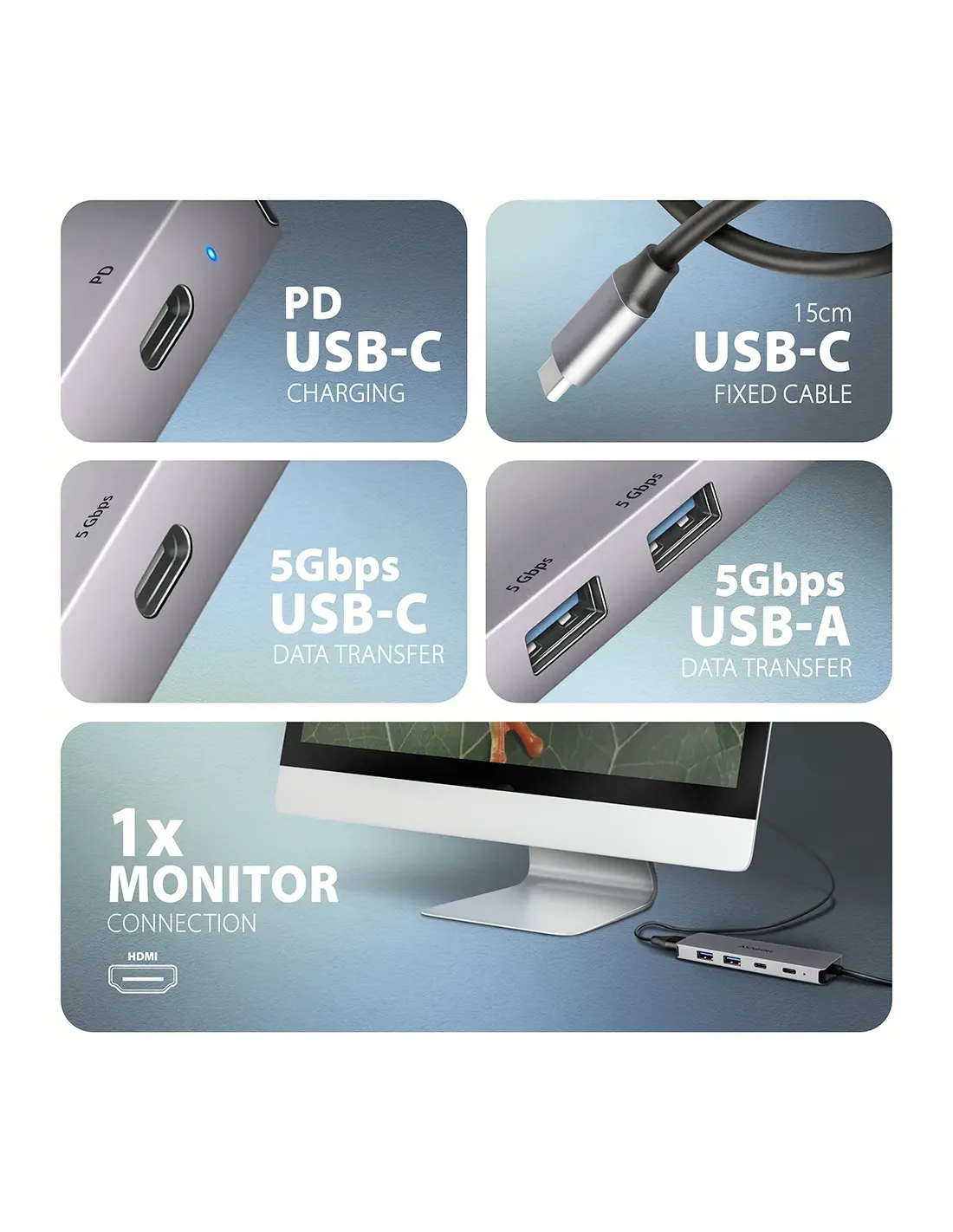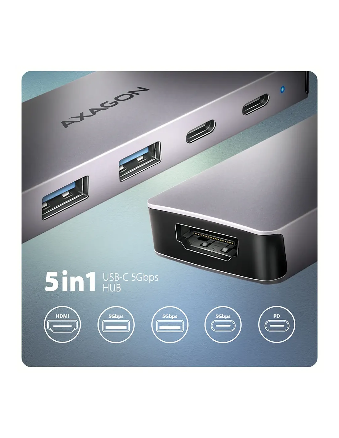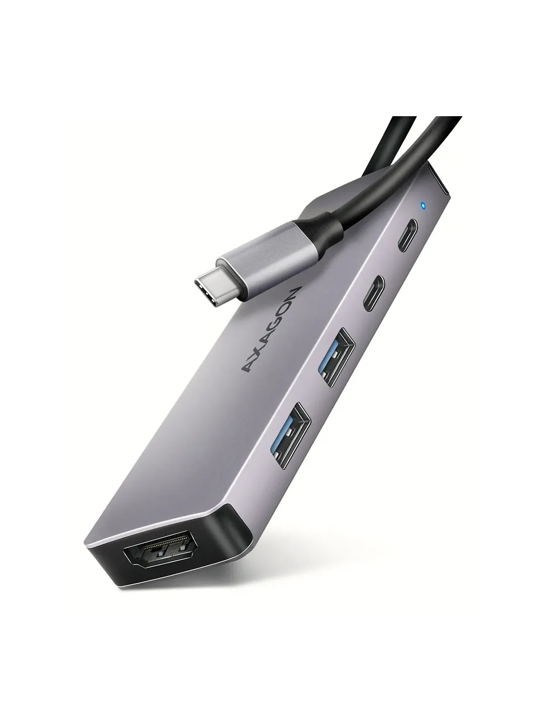 Axagon HMC-5H60. Tecnologia di connessione: Cablato, Interfaccia host: USB 3.2 Gen 1 (3.1 Gen 1) Type-C, Fornitura di alimentazione USB fino a: 100 W. Colore del prodotto: Grigio, Velocità di trasferimento dati: 5 Gbit/s, Tipologia HD: 4K Ultra HD. Tipologia alimentazione: USB, Connettore di alimentazione: USB tipo-C, Voltaggio di uscita: 20 V. Larghezza: 110 mm, Profondità: 32 mm, Altezza: 11 mm. Quantità per pacco: 1 pz, Larghezza imballo: 94 mm, Profondità imballo: 20 mm