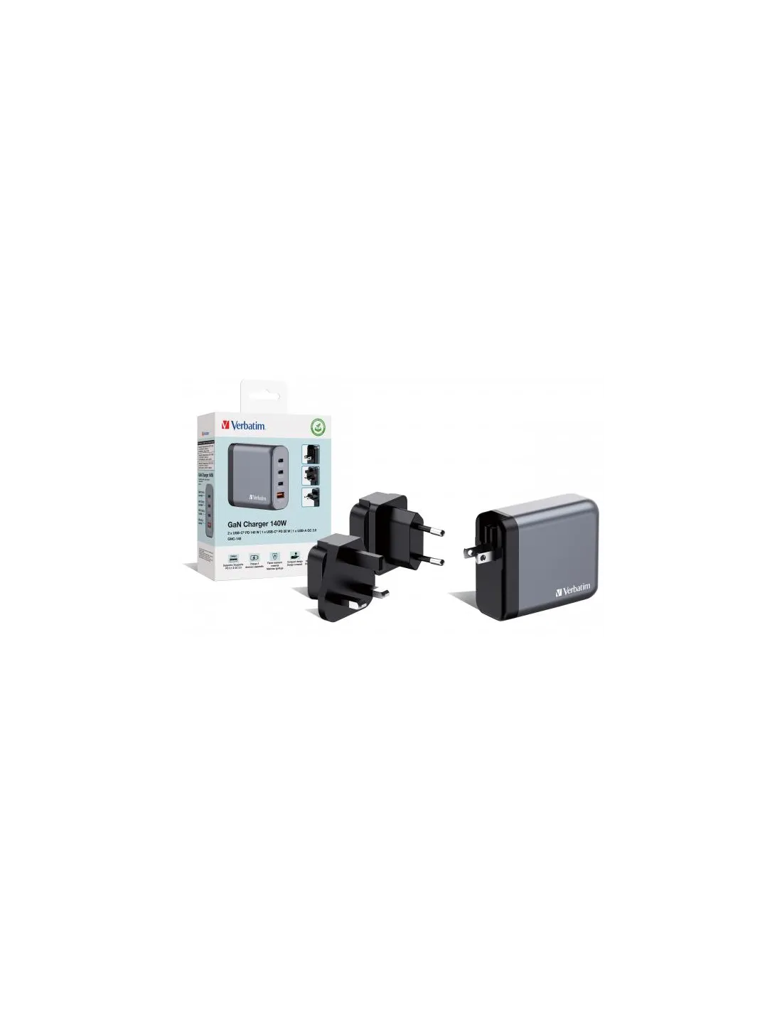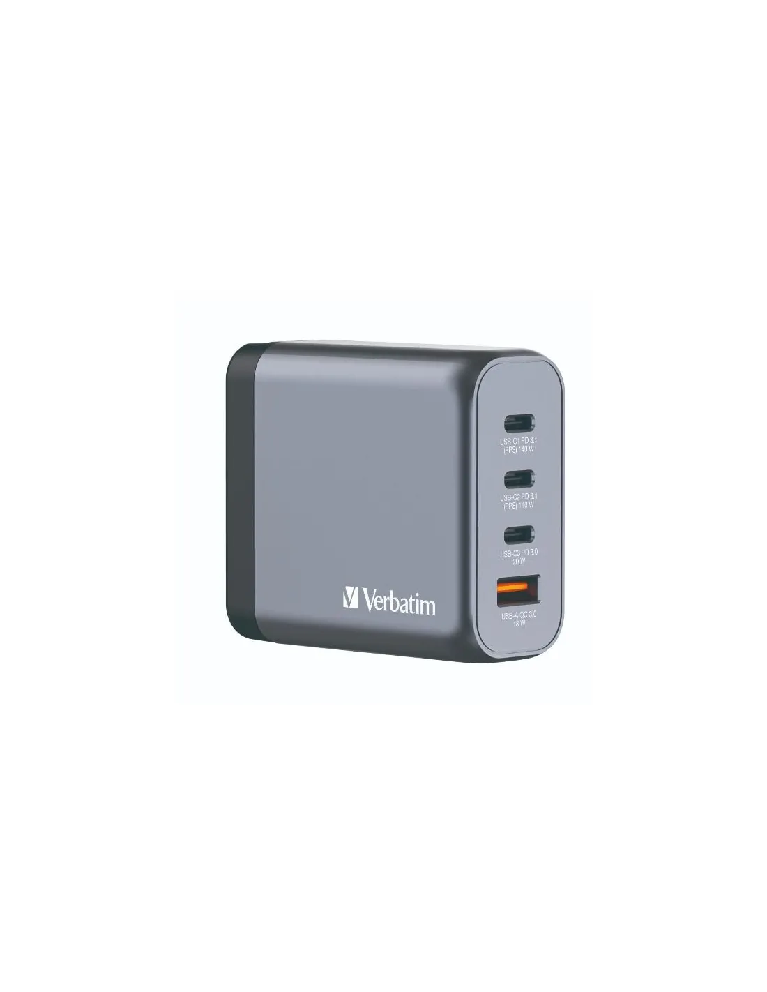 Il caricabatteria da parete GaN 140 W di Verbatim unisce due porte USB-C PD 140 W, una porta USB-C PD 20 W e una porta USB-A QC 3.0 in un design raffinato dalle dimensioni di un palmo della mano. Ideale per l'ufficio, la casa o gli spostamenti per alimentare il portatile, il tablet, lo smartphone, i dispositivi da gaming e altro ancora.