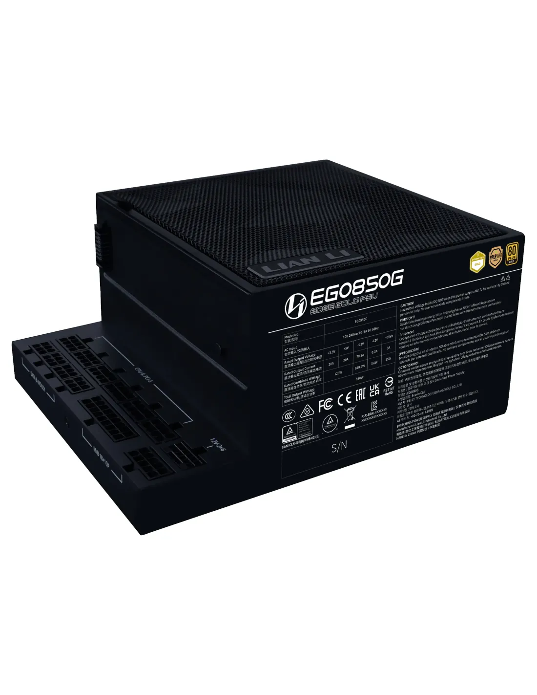 Lian Li EG0850G. Potenza totale: 850 W, Tensione di ingresso AC: 100 - 240 V, Frequenza di ingresso AC: 50/60 Hz. Connettore scheda madre: 24-pin ATX, Lunghezza del cavo di alimentazione della scheda madre: 62 cm, Lunghezza del cavo di alimentazione SATA: 300,400 mm. Utilizzo: PC, Fattore di forma dell'unità di alimentazione (PSU): SFX, Certificazione 80 PLUS: 80 PLUS Gold. Colore del prodotto: Nero, Diametro del ventilatore: 12 cm. Cavi inclusi: CPU, PCIe, Peripheral (Molex), SATA