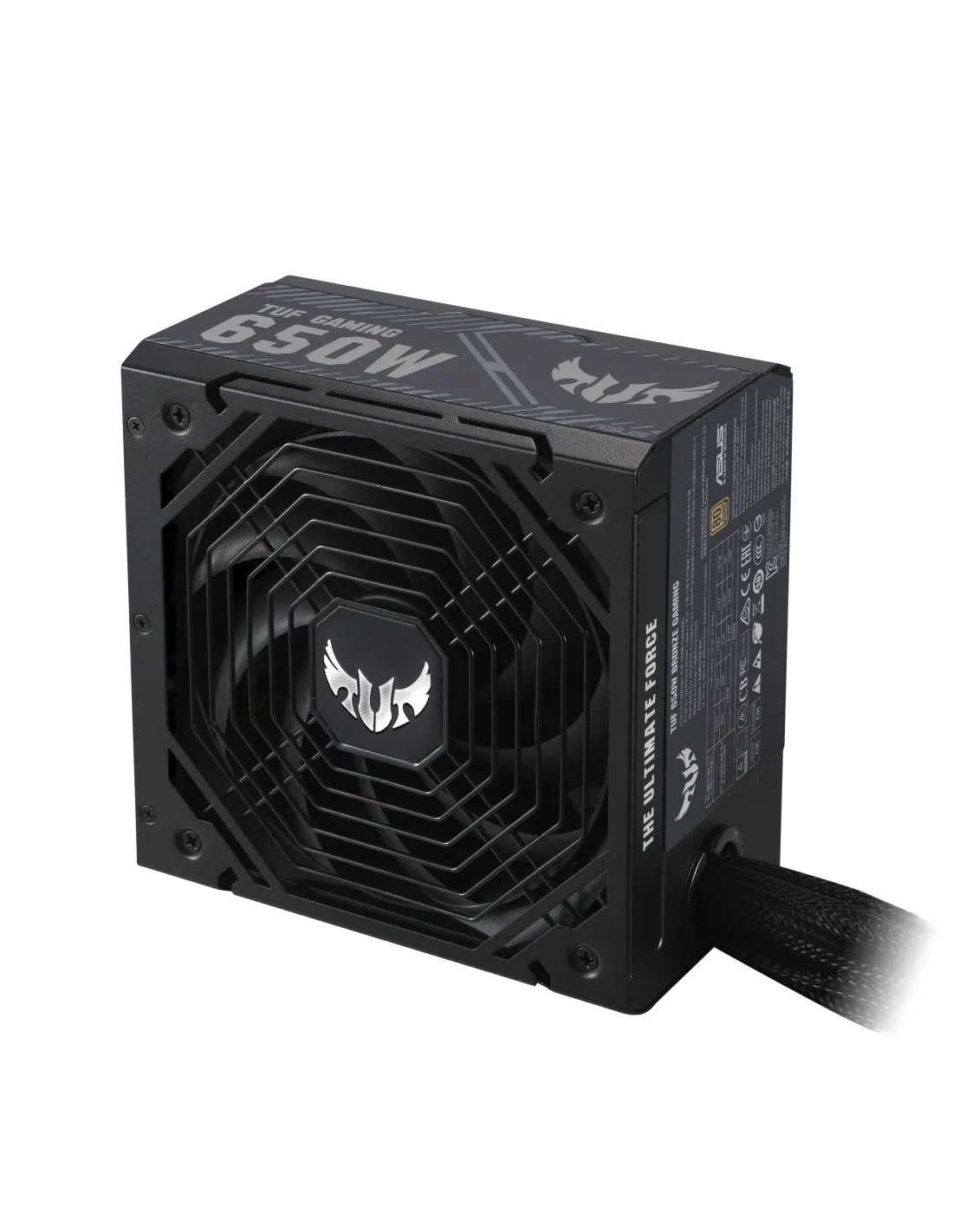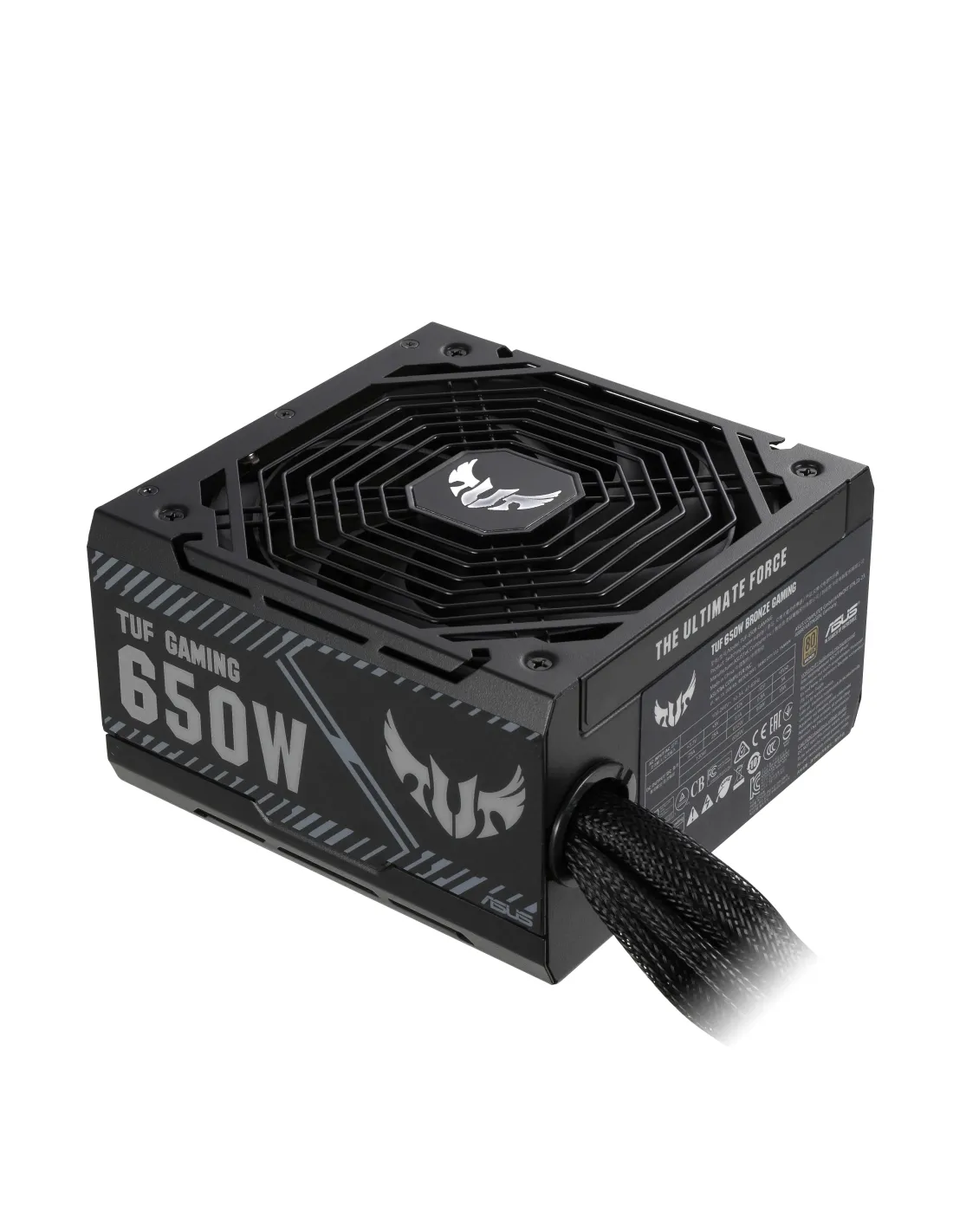 ASUS TUF-GAMING-650B. Potenza totale: 650 W, Tensione di ingresso AC: 100 - 240 V, Corrente d'ingresso: 25 A. Connettore scheda madre: 20+4 pin ATX, Lunghezza del cavo di alimentazione della scheda madre: 60 cm, Lunghezza del cavo di alimentazione SATA: 400 mm. Utilizzo: PC, Fattore di forma dell'unità di alimentazione (PSU): ATX, Certificazione 80 PLUS: 80 PLUS Bronze. Colore del prodotto: Nero, Tipo di raffreddamento: Attivo, Diametro del ventilatore: 13,5 cm. Cavi inclusi: CPU, PCIe, Peripheral (Molex), SATA