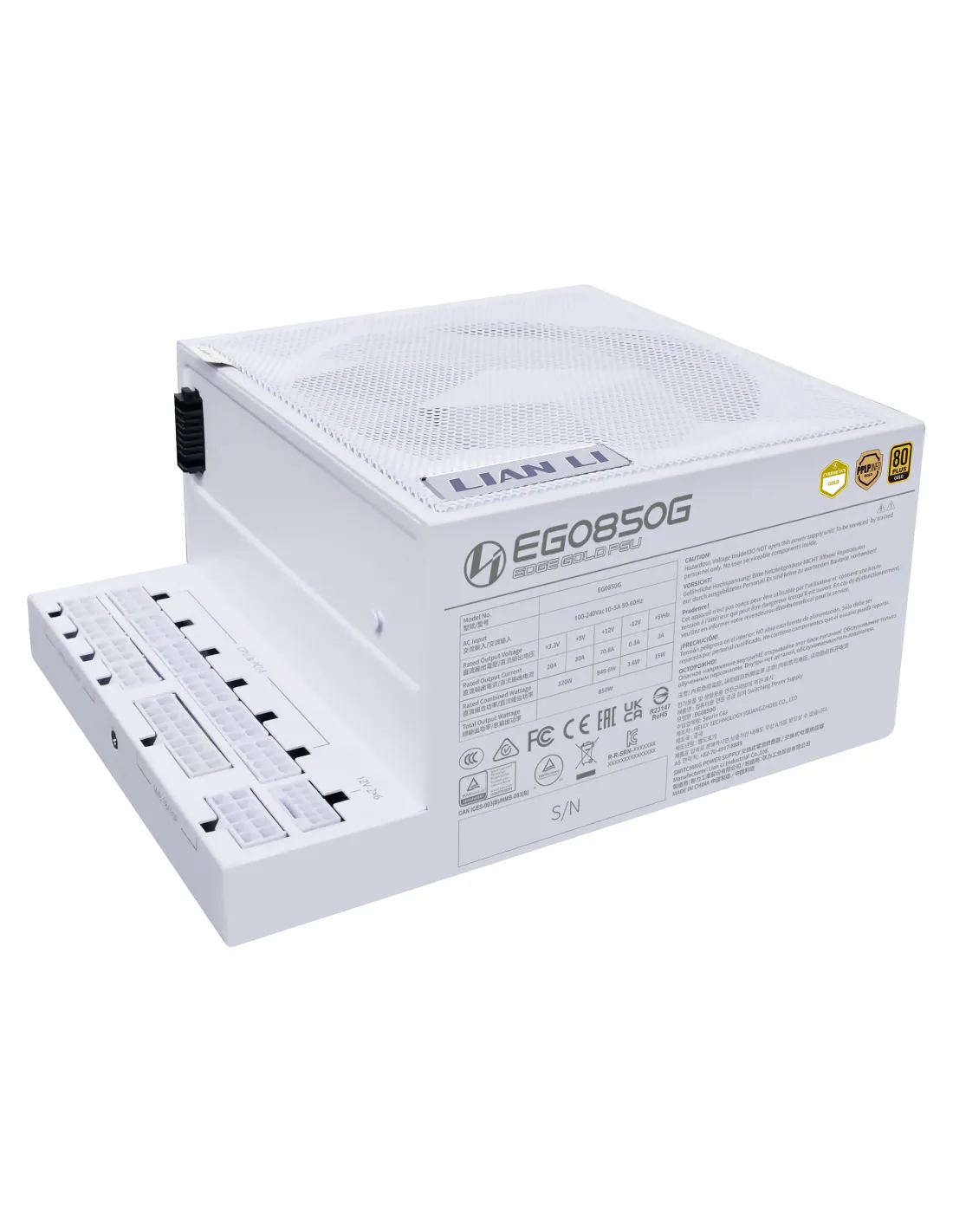 Lian Li EG0850G. Potenza totale: 850 W, Tensione di ingresso AC: 100 - 240 V, Frequenza di ingresso AC: 50/60 Hz. Connettore scheda madre: 20+4 pin ATX, Lunghezza del cavo di alimentazione della scheda madre: 50 cm, Lunghezza del cavo di alimentazione SATA: 300,400 mm. Utilizzo: PC, Fattore di forma dell'unità di alimentazione (PSU): ATX, Certificazione 80 PLUS: 80 PLUS Gold. Colore del prodotto: Bianco, Tipo di raffreddamento: Attivo, Diametro del ventilatore: 12 cm. Cavi inclusi: CPU, PCIe, Peripheral (Molex), SATA