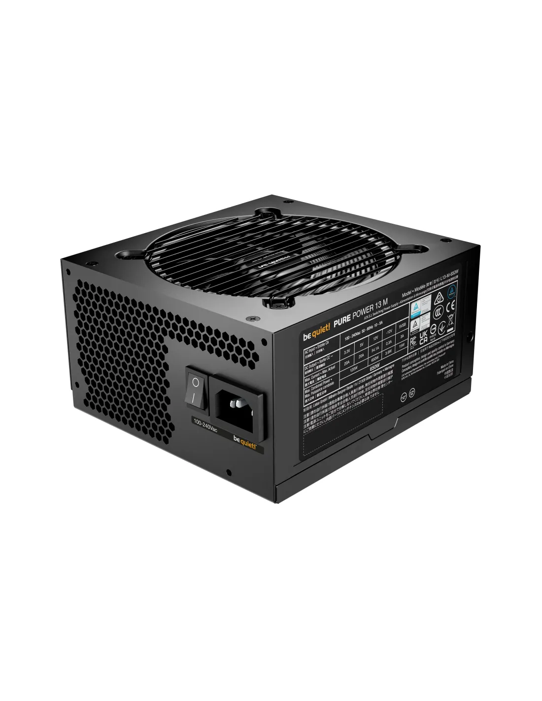 be quiet! Pure Power 13 M | 650W. Potenza totale: 650 W, Tensione di ingresso AC: 100 - 240 V, Potenza di picco: 720 W. Connettore scheda madre: 20+4 pin ATX, Lunghezza del cavo di alimentazione della scheda madre: 55 cm, Lunghezza del cavo di alimentazione SATA: 500,650,800 mm. Utilizzo: PC, Fattore di forma dell'unità di alimentazione (PSU): ATX, Certificazione 80 PLUS: 80 PLUS Gold. Colore del prodotto: Nero, Tipo di raffreddamento: Attivo, Diametro del ventilatore: 12 cm. Cavi inclusi: AC, CPU, PCIe, Peripheral (Molex), SATA