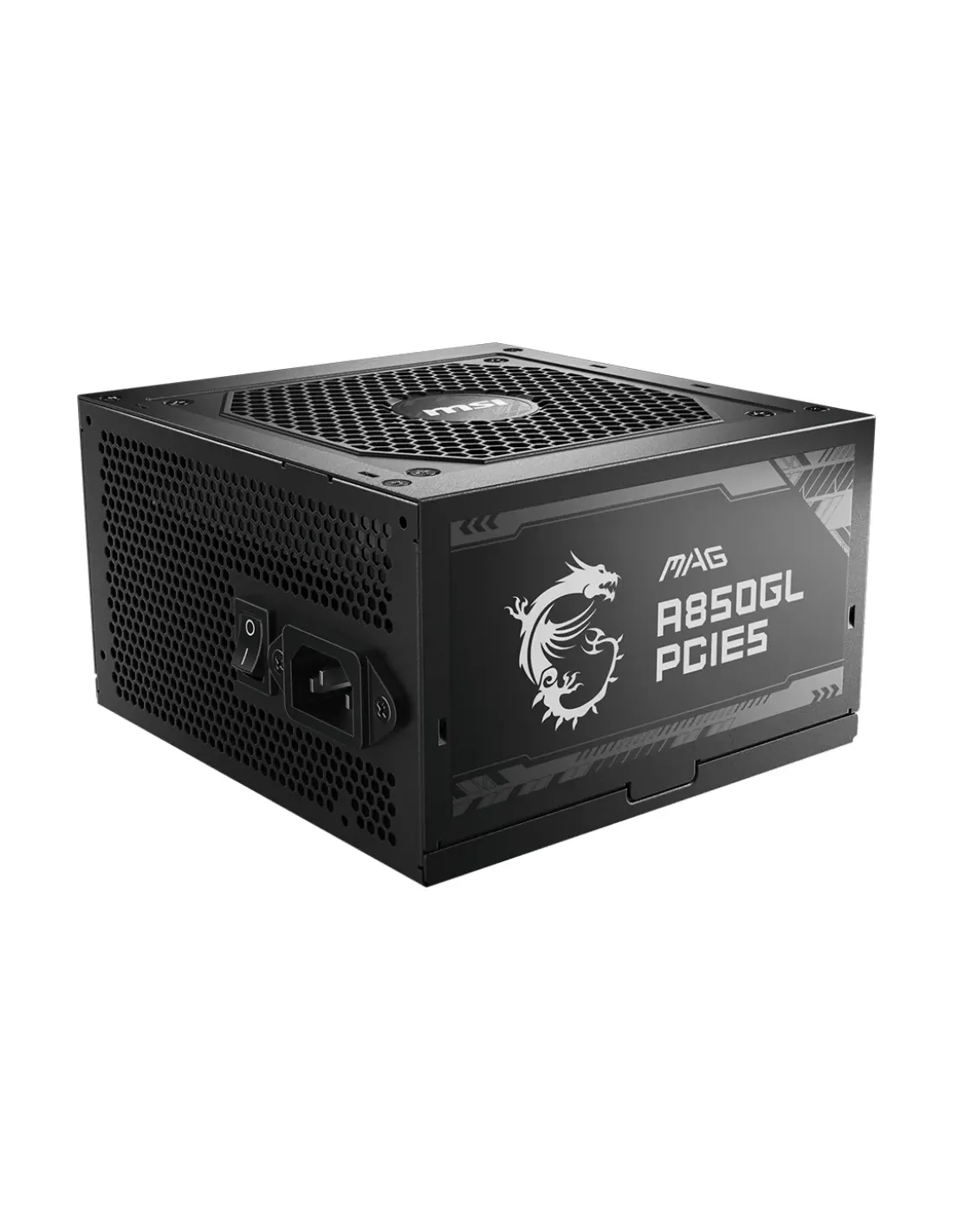 MSI MAG A850GL PCIE5. Potenza totale: 850 W, Tensione di ingresso AC: 100 - 240 V, Frequenza di ingresso AC: 47 - 63 Hz. Connettore scheda madre: 20+4 pin ATX, Lunghezza del cavo di alimentazione della scheda madre: 60 cm, Tipo di cablaggio: Totalmente Modulare. Utilizzo: PC, Fattore di forma dell'unità di alimentazione (PSU): ATX, Certificazione 80 PLUS: 80 PLUS Gold. Colore del prodotto: Nero, Tipo di raffreddamento: Attivo, Diametro del ventilatore: 12 cm. Larghezza: 150 mm, Profondità: 140 mm, Altezza: 86 mm