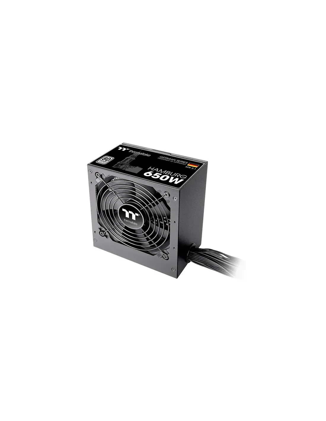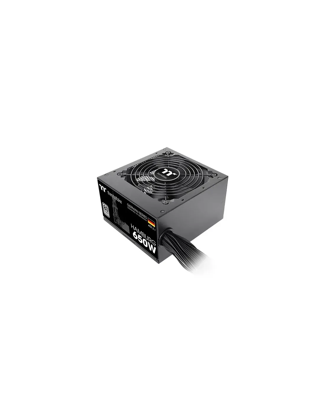 Thermaltake HAMBURG. Potenza totale: 650 W, Tensione di ingresso AC: 200 - 240 V, Potenza di picco: 650 W. Connettore scheda madre: 24-pin ATX, Lunghezza del cavo di alimentazione della scheda madre: 60 cm, Lunghezza del cavo di alimentazione SATA: 500,650,800,950 mm. Utilizzo: PC, Fattore di forma dell'unità di alimentazione (PSU): ATX, Certificazione 80 PLUS: 80 PLUS. Colore del prodotto: Nero, Tipo di raffreddamento: Attivo, Diametro del ventilatore: 12 cm. Certificati di conformità: CB, CE, Direttiva sulla bassa tensione (LVD), RCM, UKCA