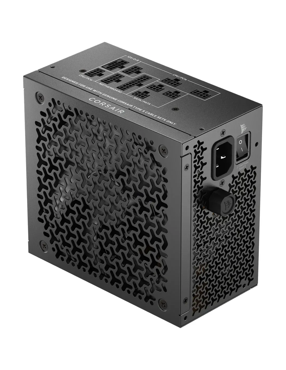Corsair RMx Shift Series RM750x. Potenza totale: 750 W, Tensione di ingresso AC: 100 - 240 V, Frequenza di ingresso AC: 47 - 63 Hz. Connettore scheda madre: 24-pin ATX, Lunghezza del cavo di alimentazione della scheda madre: 61 cm, Lunghezza del cavo di alimentazione SATA: 100,500,700 mm. Utilizzo: PC, Fattore di forma dell'unità di alimentazione (PSU): ATX, Certificazione 80 PLUS: 80 PLUS Gold. Colore del prodotto: Nero, Tipo di raffreddamento: Attivo, Diametro del ventilatore: 14 cm. Larghezza: 160 mm, Profondità: 150 mm, Altezza: 86 mm
