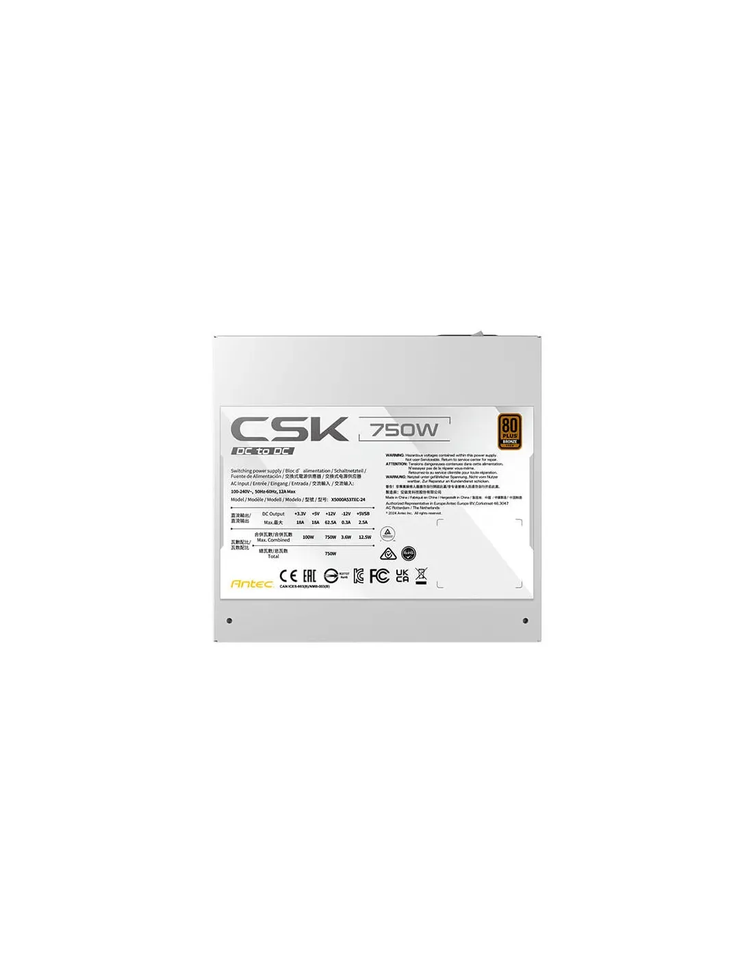 Antec CSK750DC WHITE. Potenza totale: 750 W, Tensione di ingresso AC: 100 - 240 V, Frequenza di ingresso AC: 50/60 Hz. Connettore scheda madre: 24-pin ATX, Lunghezza del cavo di alimentazione della periferica (Molex): 150,500 mm, Lunghezza del cavo di alimentazione CPU: 65 cm. Utilizzo: PC, Fattore di forma dell'unità di alimentazione (PSU): ATX, Certificazione 80 PLUS: 80 PLUS Bronze. Colore del prodotto: Nero, Diametro del ventilatore: 12 cm, Collocazione ventole: Alto. Cavi inclusi: CPU, PCIe, Peripheral (Molex), SATA