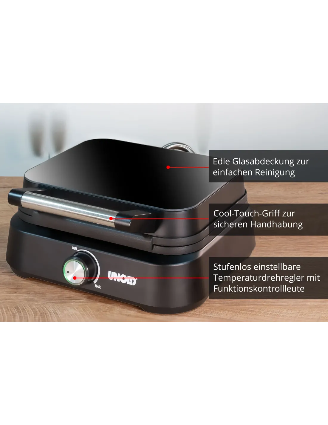 Unold 48275. Numero di waffle: 2 waffle, Stampo per waffle: Rettangolare, Colore del prodotto: Nero. Potenza: 1500 W, Tensione di ingresso AC: 220 - 240 V, Frequenza di ingresso AC: 50/60 Hz. Larghezza: 286 mm, Profondità: 292 mm, Altezza: 133 mm. peso dell'imballaggio di carta: 286 g, Peso dell'imballaggio in plastica: 54 g, Peso di altre confezioni: 0,5 g. Lingue del manuale: Tedesca, DUT, Inglese, ESP, Francese, ITA, Polacco