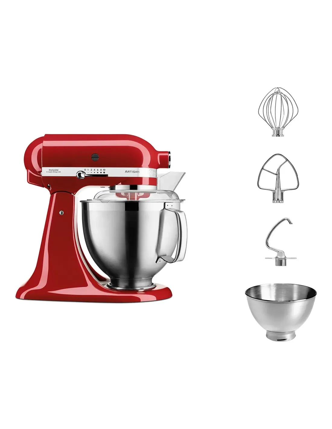 KitchenAid Artisan 5KSM185PS. Capacità ciotola: 4,8 L, Colore del prodotto: Rosso, Tipo di controllo: Leva. Materiale ciotola: Acciaio inox. Potenza: 300 W, Tensione di ingresso AC: 220 - 240 V, Frequenza di ingresso AC: 50 - 60 Hz. Larghezza: 240 mm, Profondità: 370 mm, Altezza: 360 mm. Larghezza imballo: 406 mm, Profondità imballo: 273 mm, Altezza imballo: 413 mm