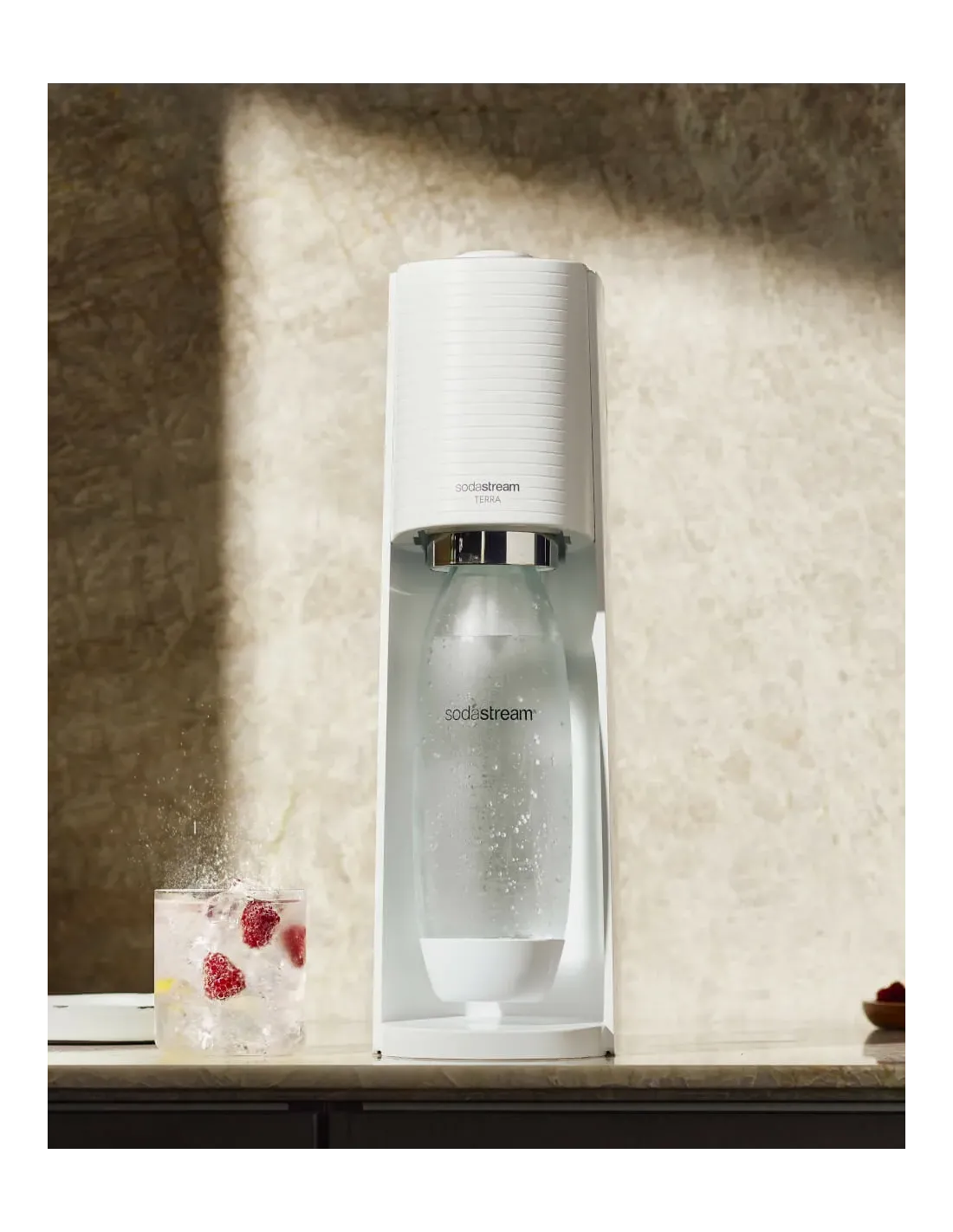 Con il gasatore Sodastream Terra, ridurre i rifiuti e l'impatto ambientale diventa un'abitudine quotidiana, grazie alla possibilità di gasare l'acqua del rubinetto e aggiungere deliziosi aromi.