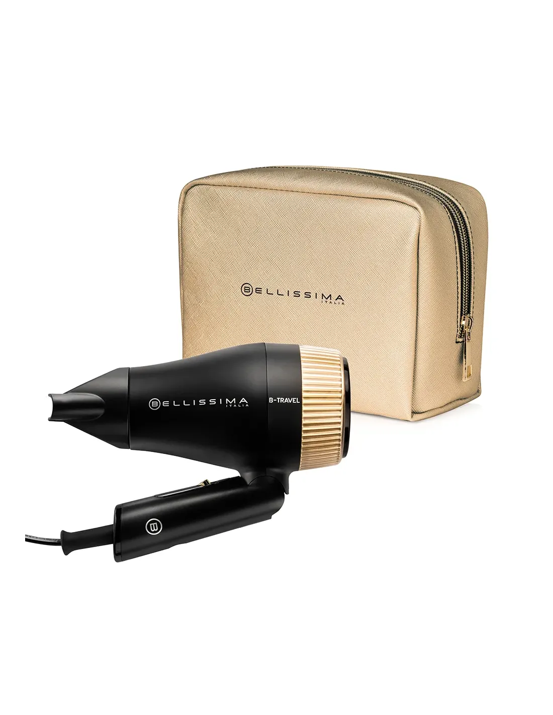 BellissimaBellissima Imetec B-Travel Asciugacapelli da viaggio, portatile e compatto, 1400 W, manico pieghevole, doppio voltaggio, concentratore di precisione, 2 combinazioni aria/temperatura, custodia da viaggio, idea regalo, AC, Nero, Oro, Monocromatico, 1,8 m, 1400 W, 110 - 120/220 - 240 V