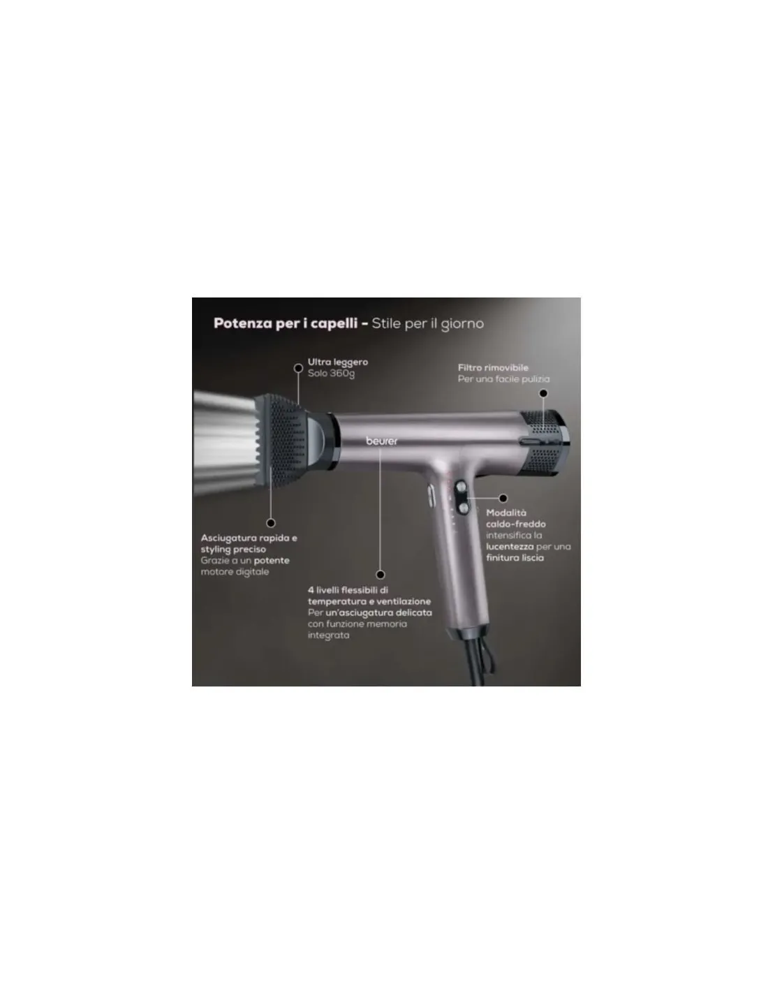 3 livelli di temperatura e 4 livelli di ventilazione flessibili per un'asciugatura delicata