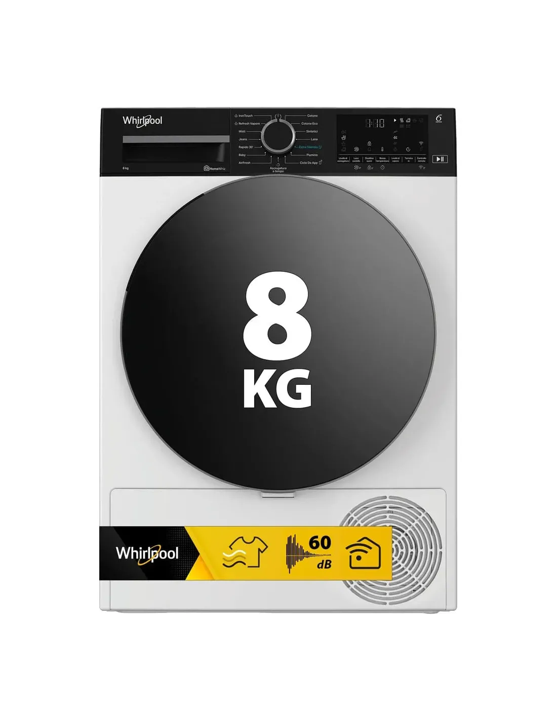 Whirlpool C WD 86M WBS IT, Capacità 8kg, classe A, colore White, Display digitale XL, Wi-Fi, IronTouch, Libera installazione, Caricamento frontale, Pompa di calore, Bianco, Manopola, Touch, Nero