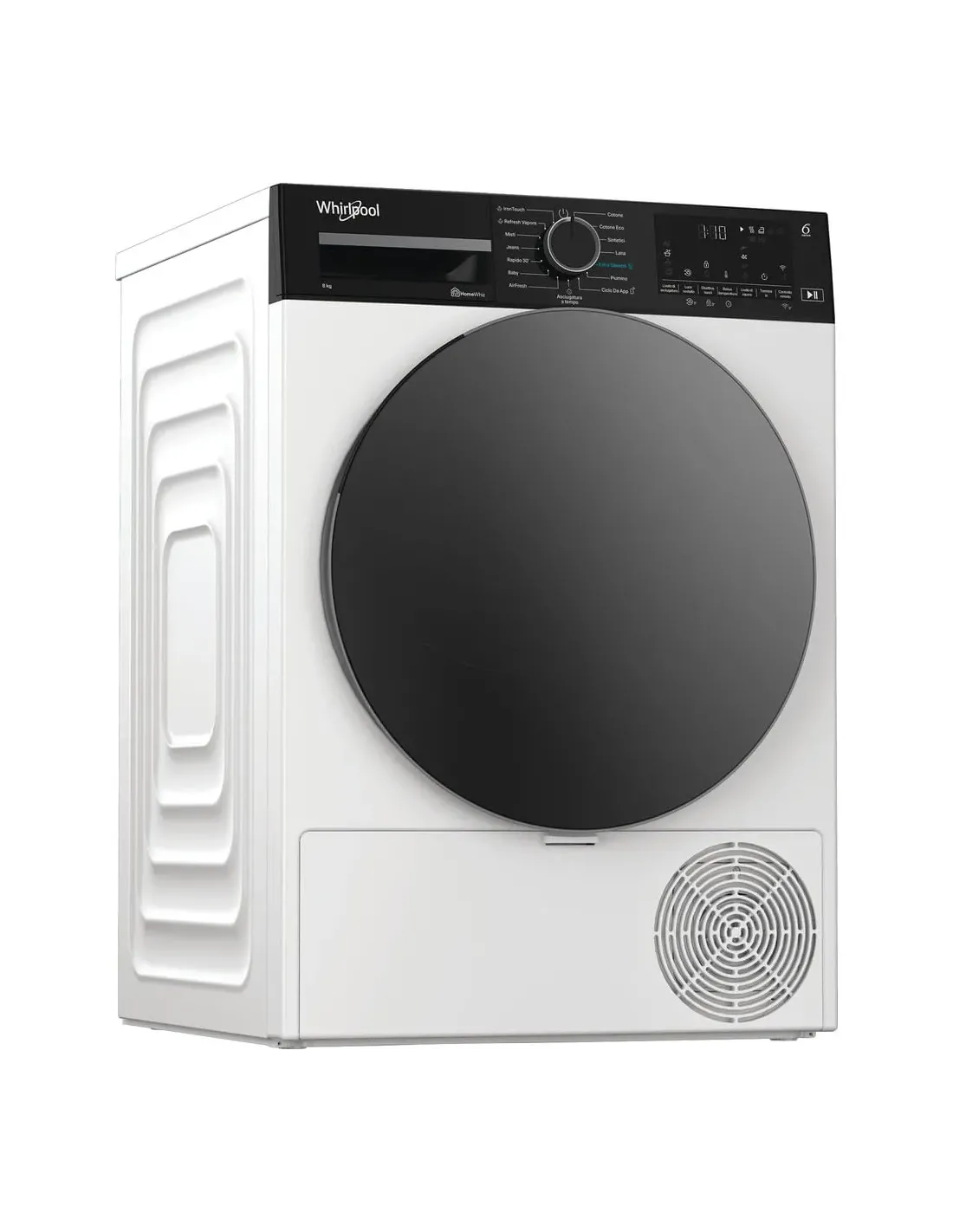 Caratteristiche di questa asciugatrice a libera installazione Whirlpool: cestello spazioso da 8,0 kg. Esclusiva tecnologia 6° SENSO che monitora costantemente il livello di umidità nel tamburo per proteggere i tuoi vestiti e garantire un'asciugatura perfetta. Funzione di connessione che consente all'elettrodomestico di ricevere informazioni riguardo il ciclo di lavaggio utilizzato e regolare le impostazioni di conseguenza per risultati perfetti. Azione di asciugatura delicata e igienica, che riduce le pieghe e rinfresca i tuoi vestiti. Tecnologia a pompa di calore riscalda efficacemente l’aria nell'elettrodomestico, riducendo significativamente il consumo energetico.
