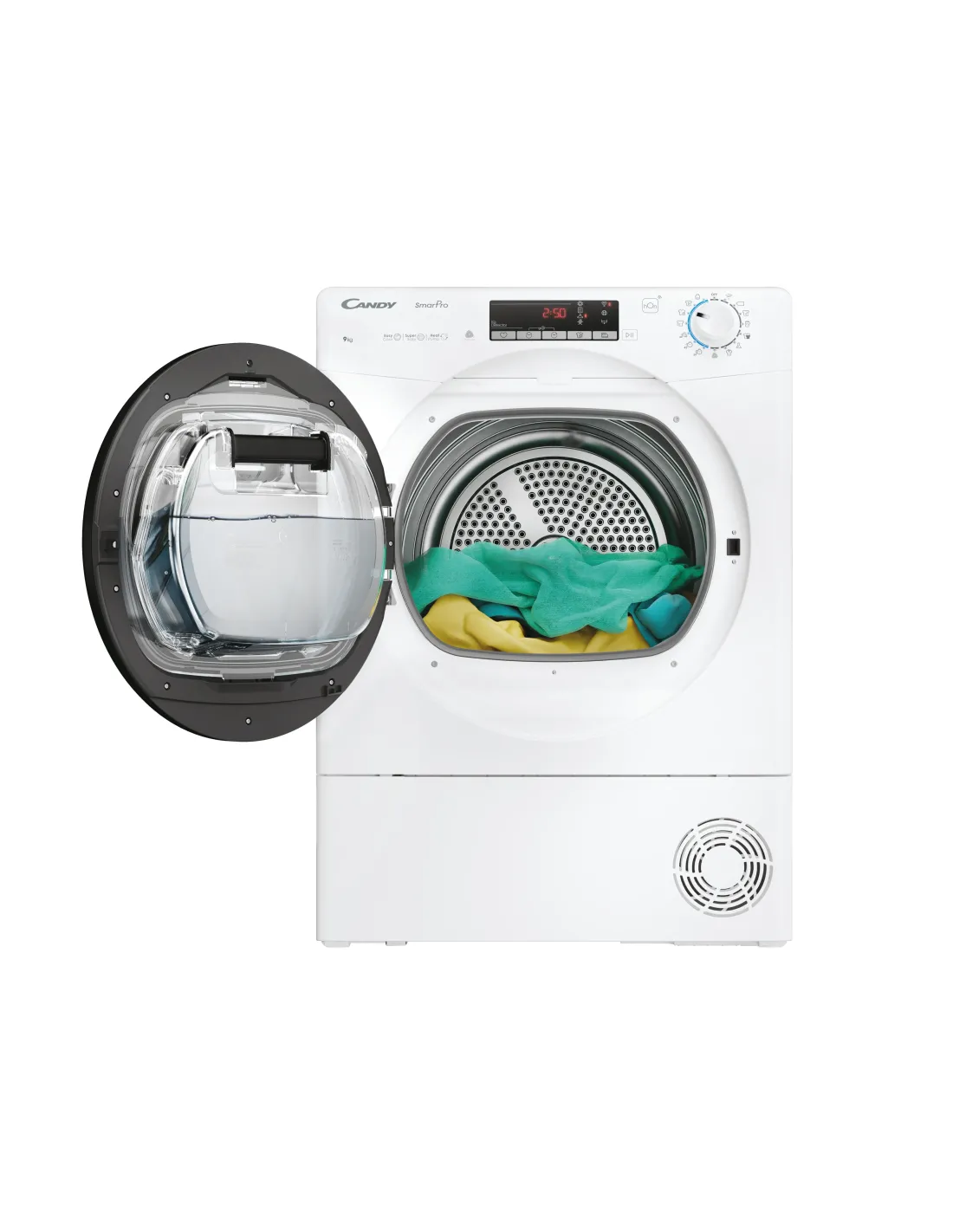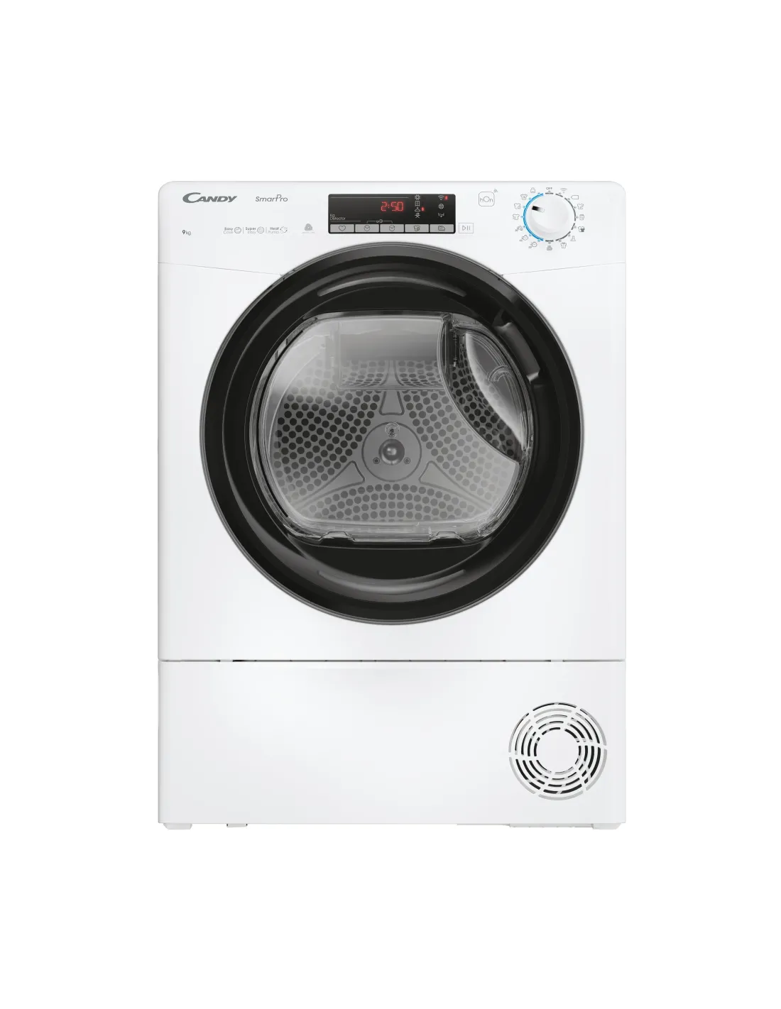 Candy Smart Pro , Asciugatrice 9 KG, Classe E, Bianco, Vapore, Wi-Fi, CROE H9A2TBE-S, Libera installazione, Caricamento frontale, Pompa di calore, Bianco, Manopola, Touch, Sinistra