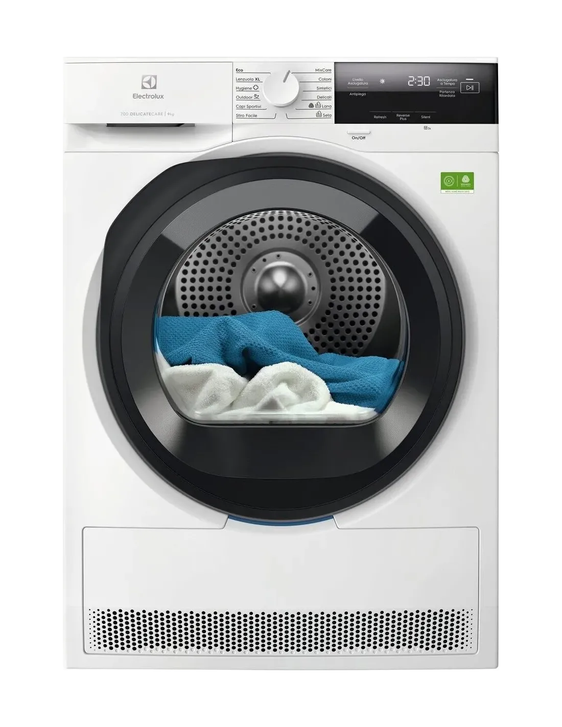 Electrolux ASCIUGATRICE 9 KG CLASSE B EW7H39B MADE IN EUROPE, Libera installazione, Caricamento frontale, Pompa di calore, Bianco, Manopola, Touch, Destra