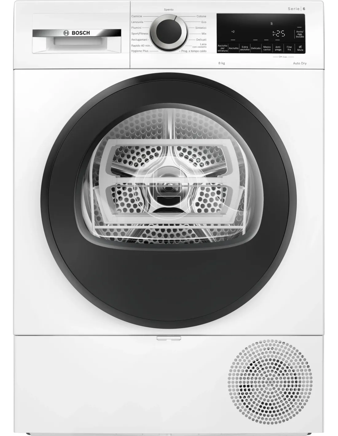 Bosch Serie 6 WQG233D1II. Posizionamento dell'apparecchio: Libera installazione, Tipo di carica: Caricamento frontale, Sistema di asciugatura: Pompa di calore. Capacità cestello: 8 kg, Classe di efficienza della condensazione: B, Programmi di asciugatura: Camicia/maglietta, Cotone, Cotton eco, Delicati/Seta, Piumino/piumone, Igiene/Allergy Care, Mix,.... Classe efficienza energetica: C, Consumo energetico per 100 cicli: 102 kWh, Consumo energetico: 1,02 kWh. Tecnologie Bosch (cura dei vestiti): Design antivibrazioni, autoDry, EasyClean, SensitiveDrying. Profondità: 613 mm, Larghezza: 598 mm, Altezza: 842 mm