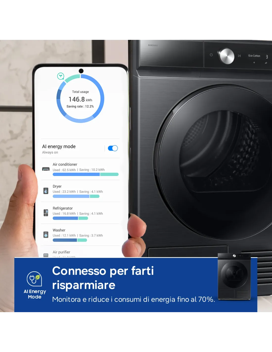 Monitora e riduci il consumo di energia della tua asciugatrice. Grazie alla modalità AI Energy[14] , potrai monitorare in modo semplice e immediato i consumi energetici e prevederli in anticipo. Selezionando questa modalità con alcuni programmi[15] , sarà possibile ridurre i consumi energetici fino al 20%[16] regolando la velocità del compressore inverter e la durata del ciclo.