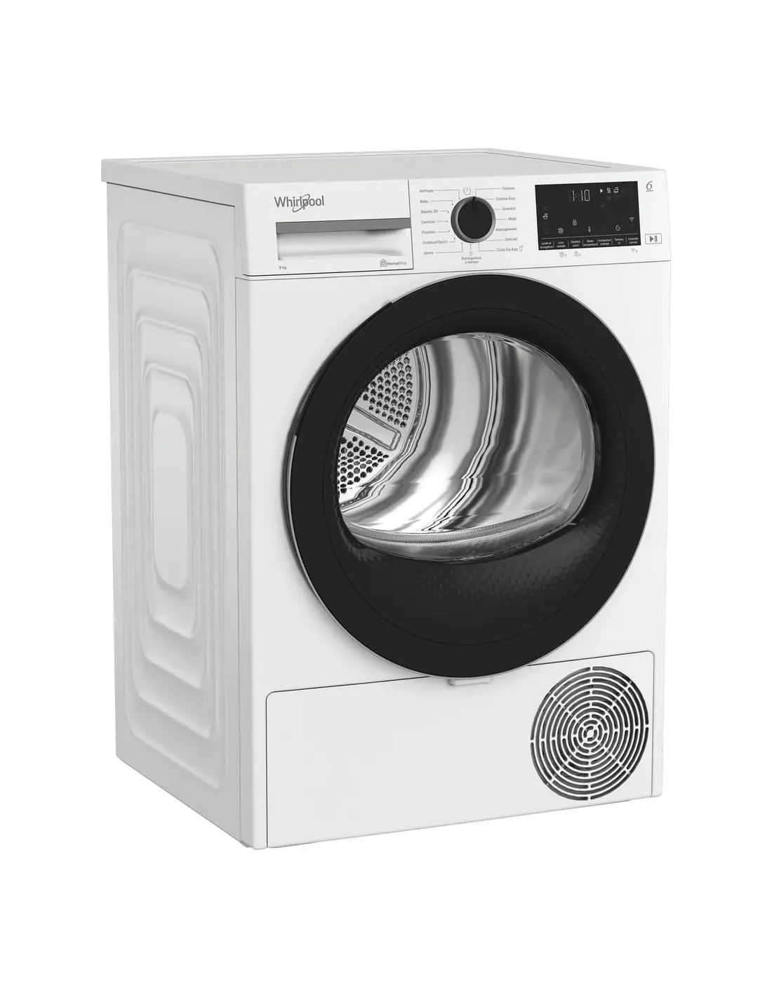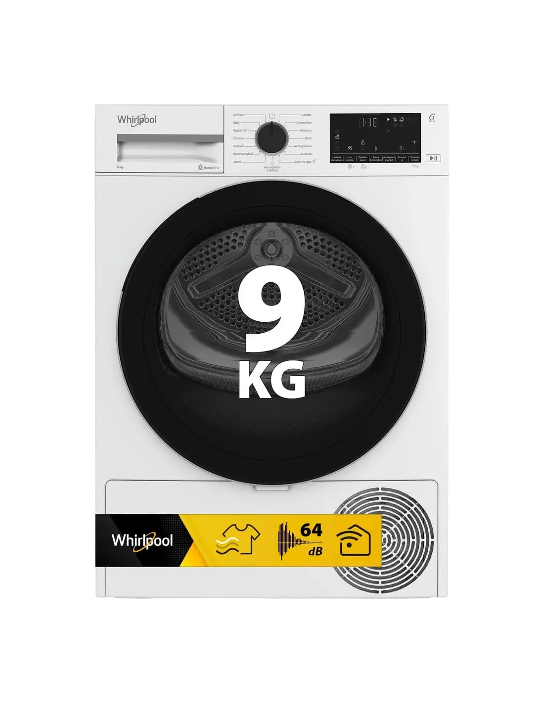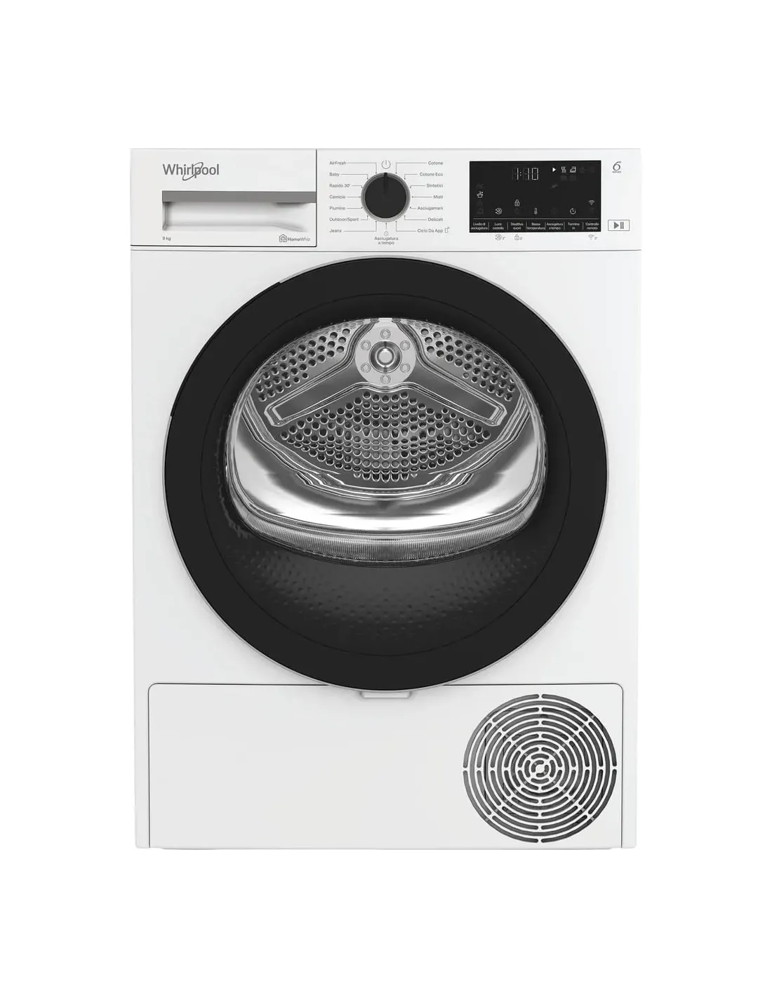 Caratteristiche di questa asciugatrice a libera installazione Whirlpool: eccezionale capacità del cestello di 9,0kg per non restare mai senza spazio. Esclusiva tecnologia 6° SENSO che monitora costantemente il livello di umidità nel tamburo per proteggere i tuoi vestiti e garantire un'asciugatura perfetta. Funzione di connessione che consente all'elettrodomestico di ricevere informazioni riguardo il ciclo di lavaggio utilizzato e regolare le impostazioni di conseguenza per risultati perfetti. Tecnologia a pompa di calore riscalda efficacemente l’aria nell'elettrodomestico, riducendo significativamente il consumo energetico.