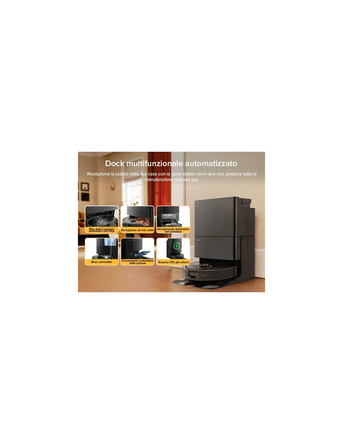 La stazione multifunzione automatizza completamente la manutenzione: svuota la polvere (fino a 9 settimane), lava i mop e li asciuga con aria calda per prevenire odori e batteri. Il serbatoio dell’acqua si riempie automaticamente, consentendo la pulizia continua fino a 329 m².