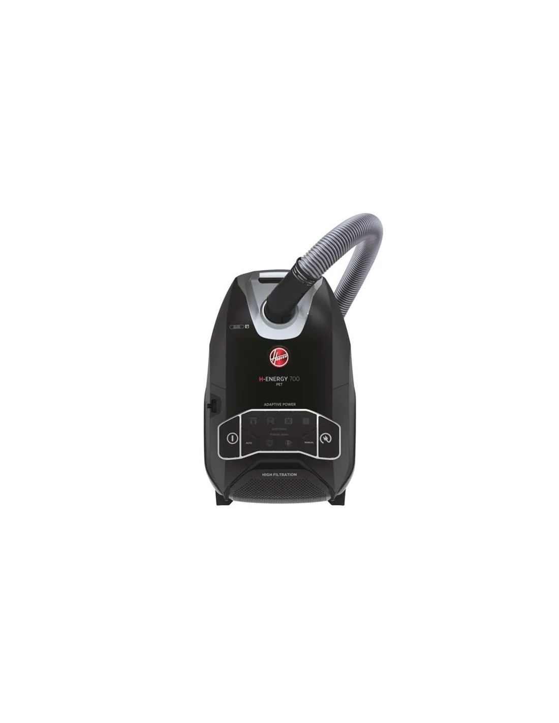 HE720PET 011H-ENERGY 700Massima igiene e prestazioni adatte a ogni esigenza: H-ENERGY 700 è l'aspirapolvere con sacco da 5 Litri che consente risultati di pulizia eccezionali.Alta efficienza di filtraggioDotato di un sacco Epa da 5 Litri e di un filtro Epa antibatterico e lavabile per consentire un ottimo filtraggio dell'aria.Display intuitivoGrazie al display intuitivo puoi semplicemente selezionare la modalità di pulizia: AUTOMATICA o MANUALE. Scegli il livello di potenza più adatto alla superficie da pulire e grazie agli indicatori LED puoi controllare la manutenzione del sacco e del filtro.Raggio d'azione di 9,5 mH-ENERGY 700 possiede un cavo della lunghezza di 9,5 m grazie al quale è possibile raggiungere facilmente anche i punti più lontani senza doversi fermare o togliere la presa.Estremamente silenziosaUna progettazione studiata per ottenere ottimi risultati di pulizia su tutte le superfici con un basso livello di rumorosità: solo con 64 dBA, la tua aspirapolvere silenziosa!Impugnatura ergonomicaH-ENERGY 700 presenta una comodissima impugnatura ergonomica caratterizzata da una spazzola integrata ideale per le superfici dure.Massimo livello di igieneL’aspirapolvere con filtro hepa garantisce l'assenza di contatto con la polvere grazie al suo sistema automatico di rimozione del sacco. È sufficiente premere il pulsante per sganciare il sacco dalla tua aspirapolvere a traino nel modo più igienico possibile. Ideale per chi soffre di allergia o di asma.Potenza automaticaGrazie alla funzione AUTO, l'aspirapolvere H-ENERGY 700 regola automaticamente il livello di potenza per permetterti di pulire la tua casa con il minimo sforzo. Quando il sensore riconosce che il pavimento è sporco, aumenta la potenza; quando riconosce che il pavimento è pulito, la potenza automaticamente decresce.Mini turbospazzola per i peli di animaliChi ha cani o gatti d'ora in poi potrà mantenere divani, letti, sedie e tappeti liberi dai peli dei suoi animali grazie alla mini turbospazzola.
