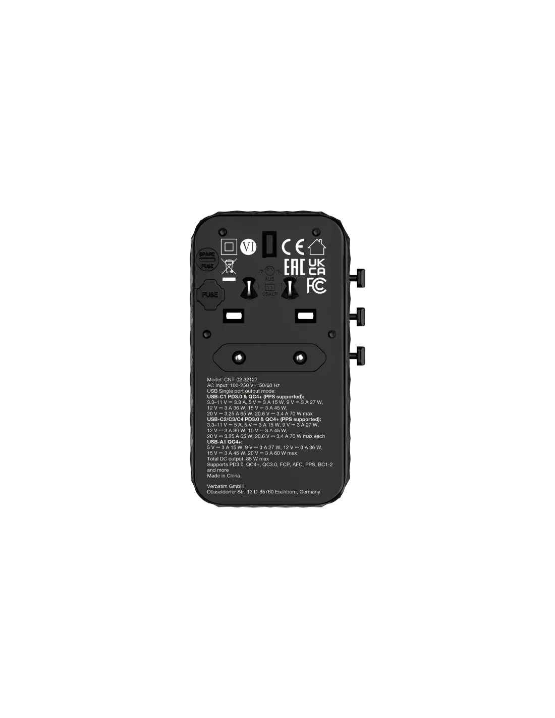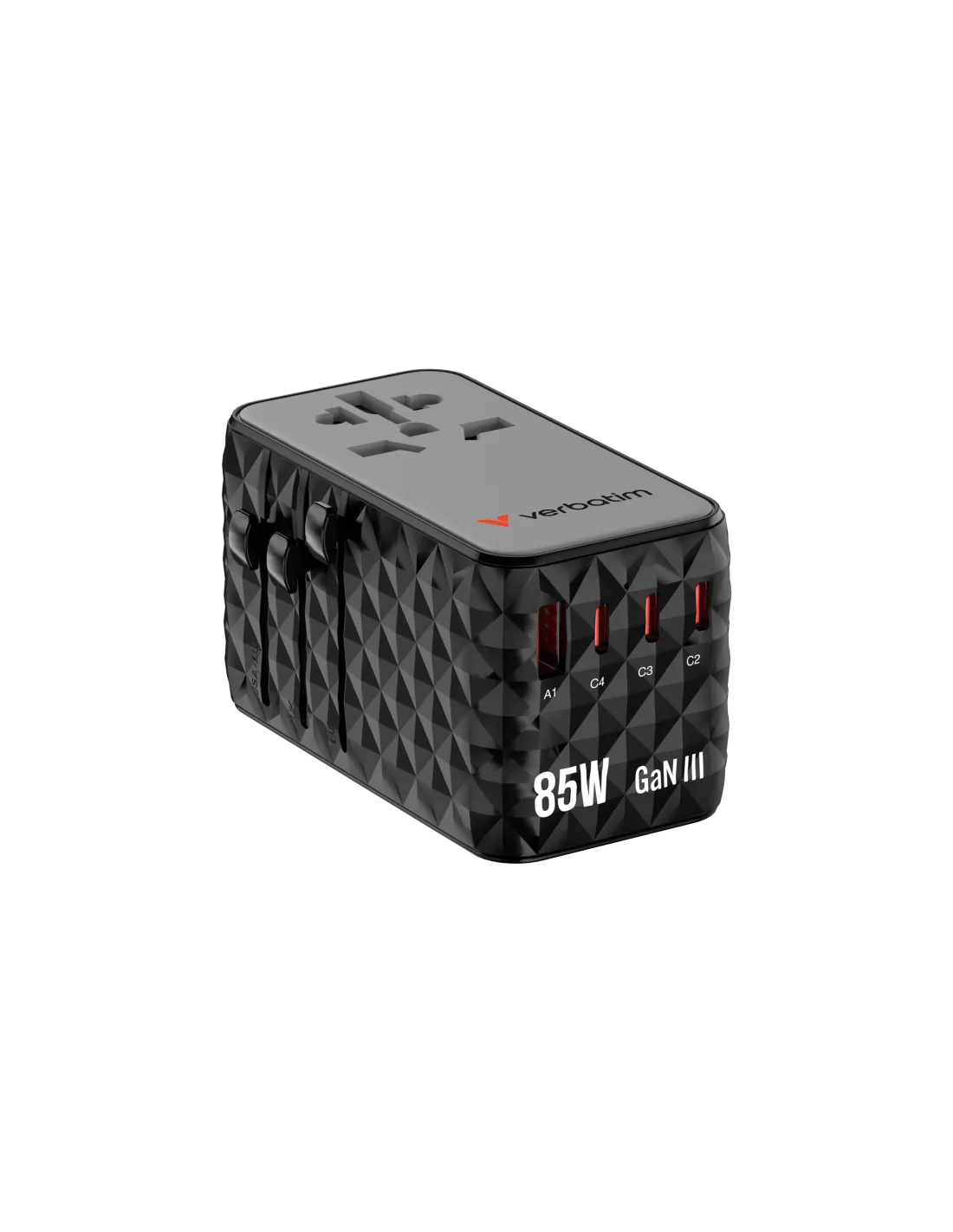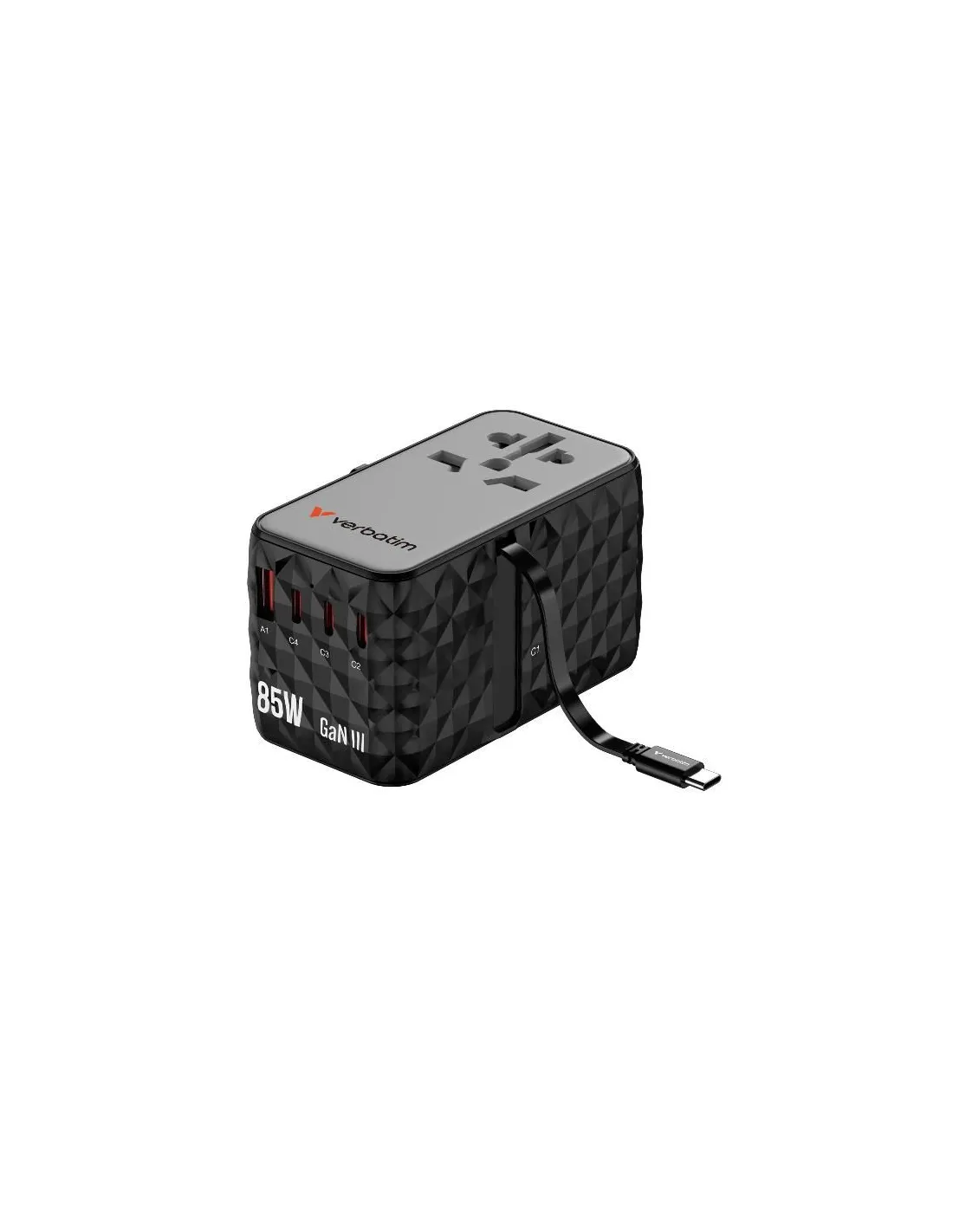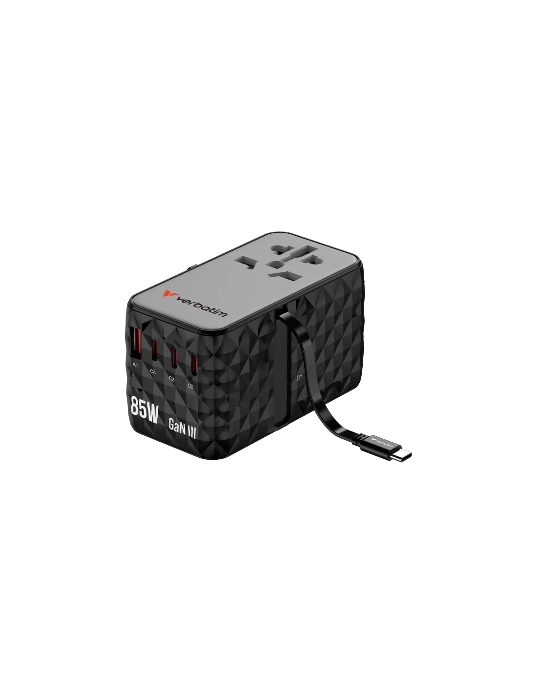 Adattatore da viaggio universale Verbatim Charge 'n' Travel GaN III da 85 W con cavo USB-C retrattile, 3 x USB-C PD 70 W e QC 4+ / 1 x USB-A QC 4+ 60 W