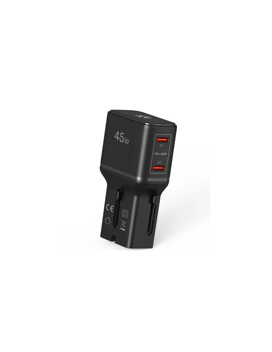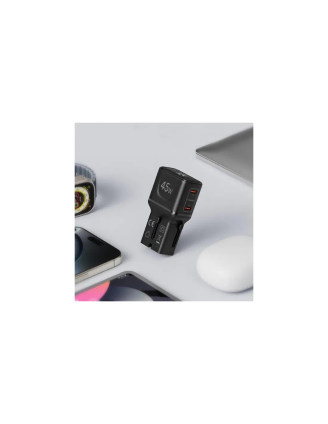 Dotato di due porta USB-C da 45W, consente la ricarica rapida simultanea di smartphone, tablet, auricolari e altri dispositivi elettronici.