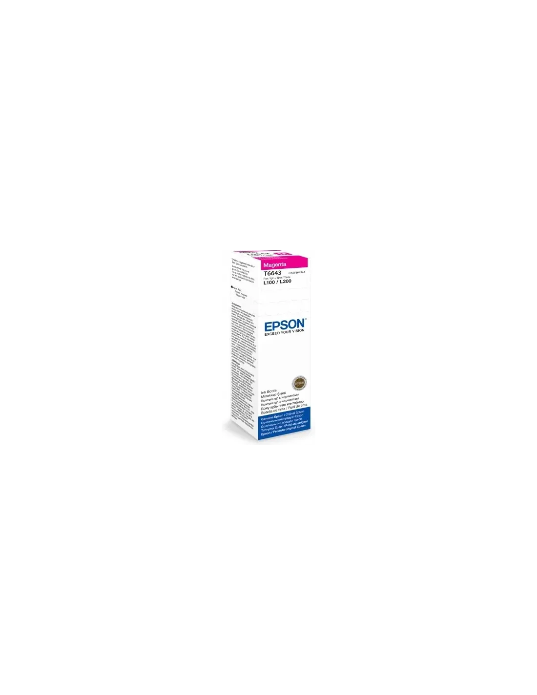 Epson T6643. Tipo: Originale, Colori di stampa: Magenta, Compatibilità: Epson L100/L110/L200/L300/L355/L550. Quantità per pacco: 1 pz, Larghezza imballo: 62 mm, Profondità imballo: 145 mm. Quantità per pallett: 1260 pz, Lunghezza del pallet: 120 cm, Ampiezza del pallet: 80 cm