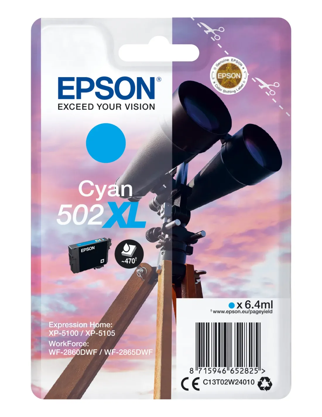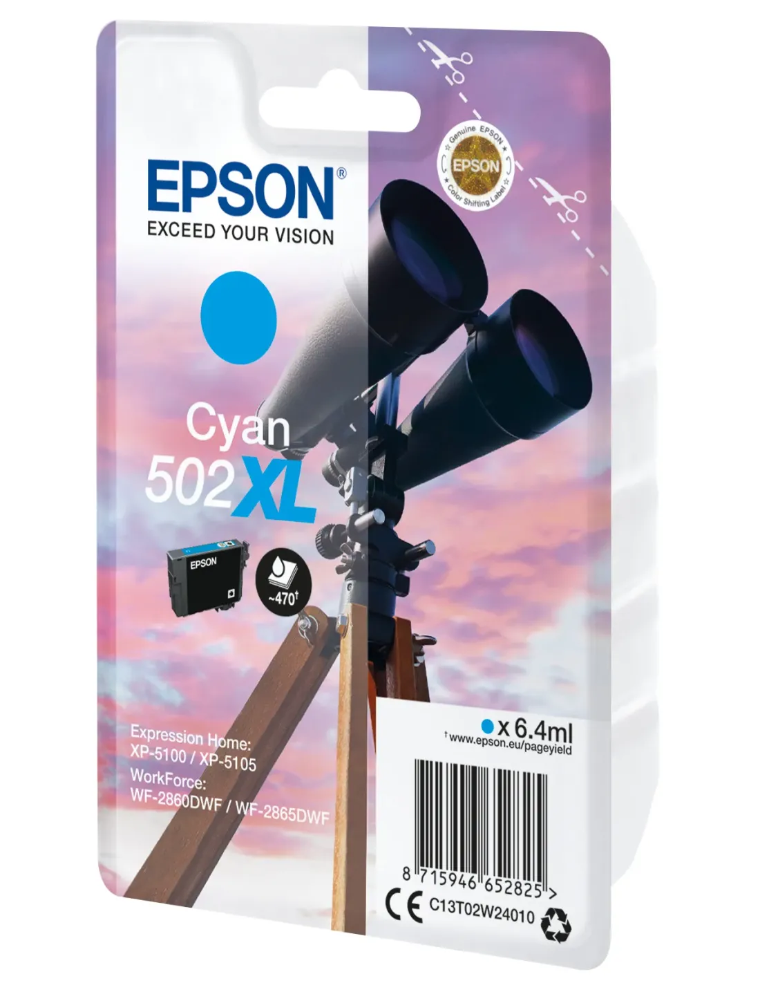 Epson Singlepack Cyan 502XL Ink. Tipo di cartuccia: Resa elevata (XL), Resa in pagine dell'inchiostro a colori: 470 pagine, Volume dell'inchiostro a colori: 6,4 ml, Colori di stampa: Ciano, Quantità per pacco: 1 pz