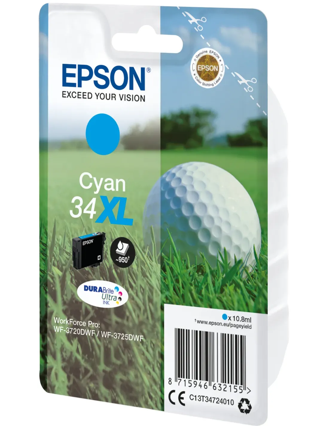 EpsonEpson Golf ball Singlepack Cyan 34XL DURABrite Ultra Ink, Resa elevata (XL), Ciano, 10,8 ml, 1 pz, 950 pagine